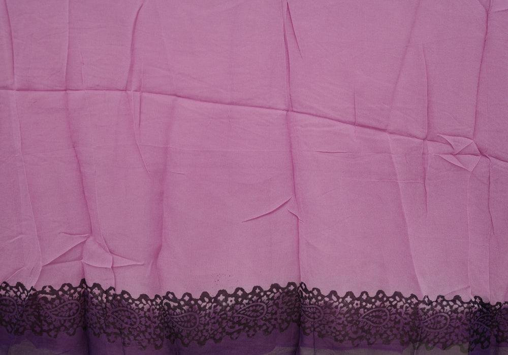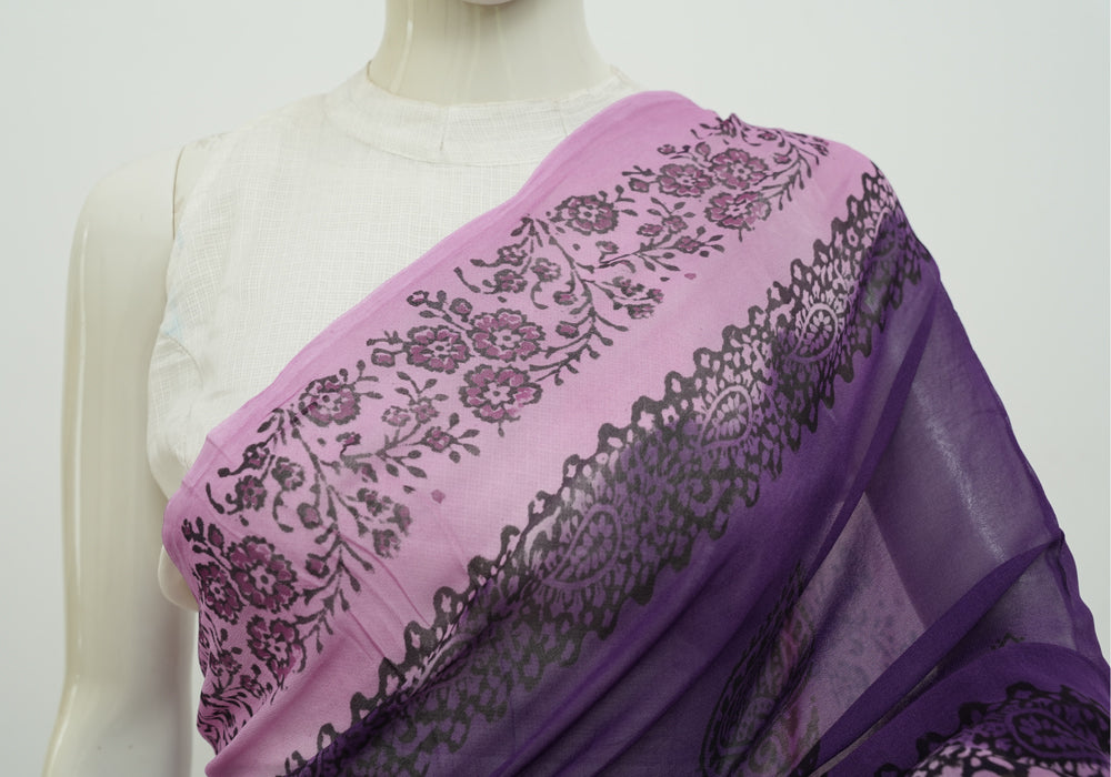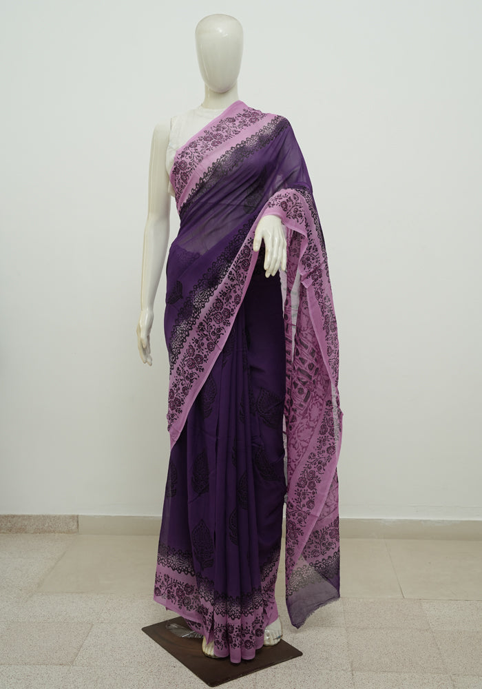 Dark Purple and Purple Block Printed Georgette Saree is OUT OF STOCK currently and available on pre-payment only. Order now for delivery within 2 weeks.