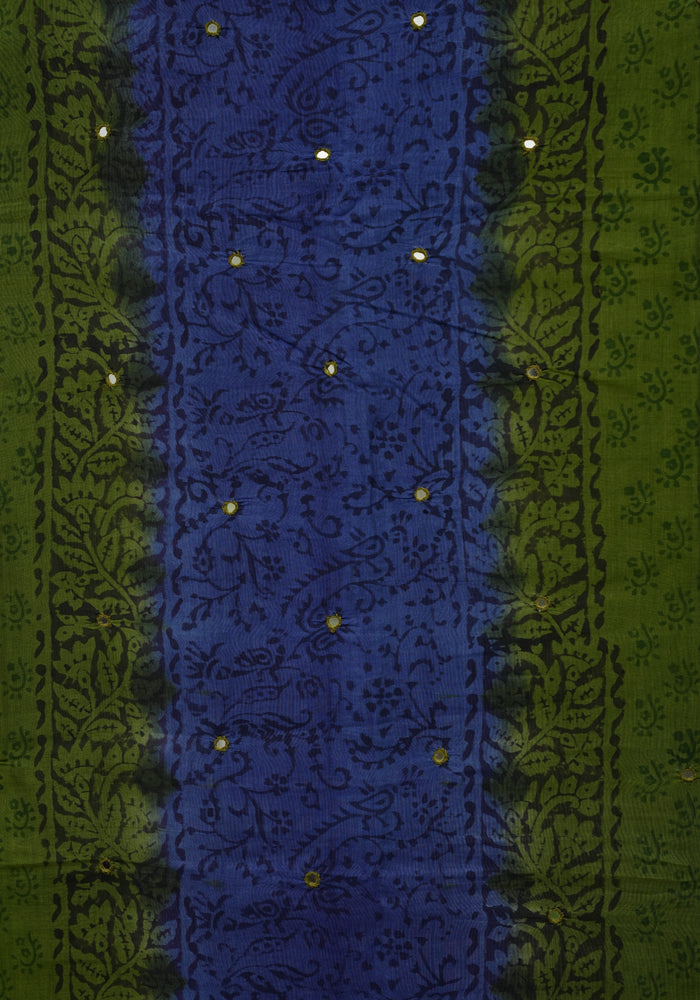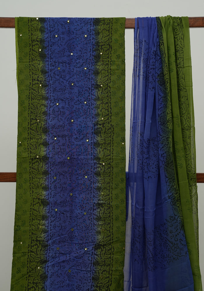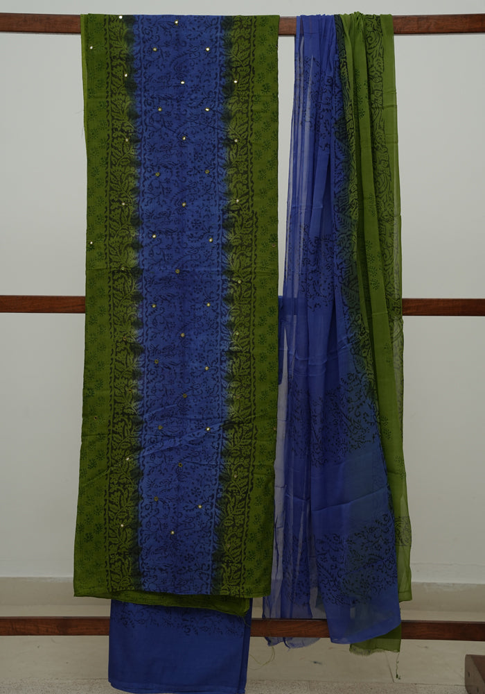 Green and Cobalt Blue Unstitched Chennur Silk Salwar Set With Mirror Work