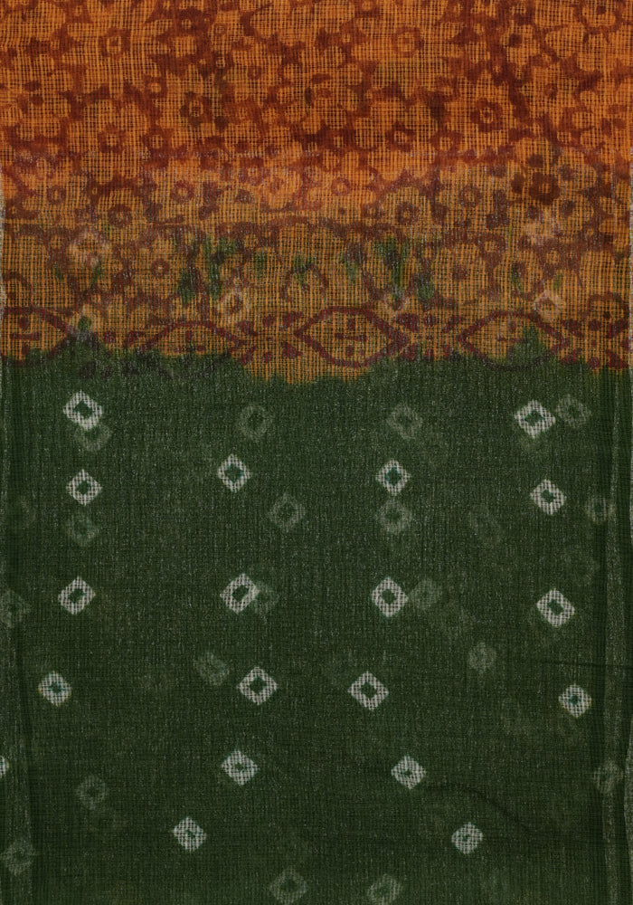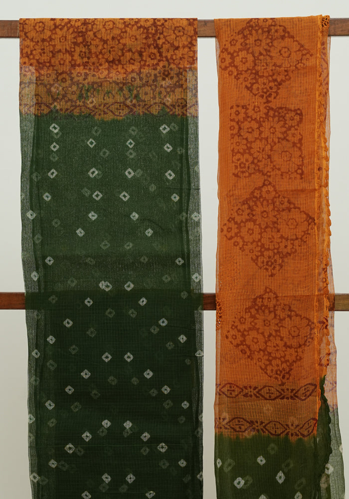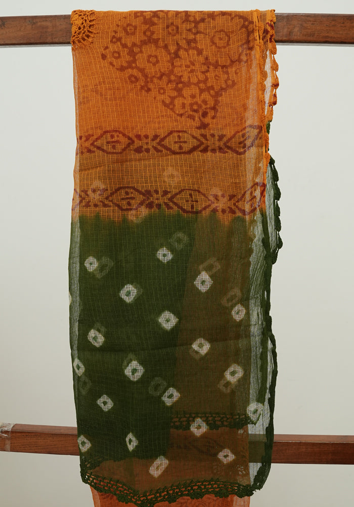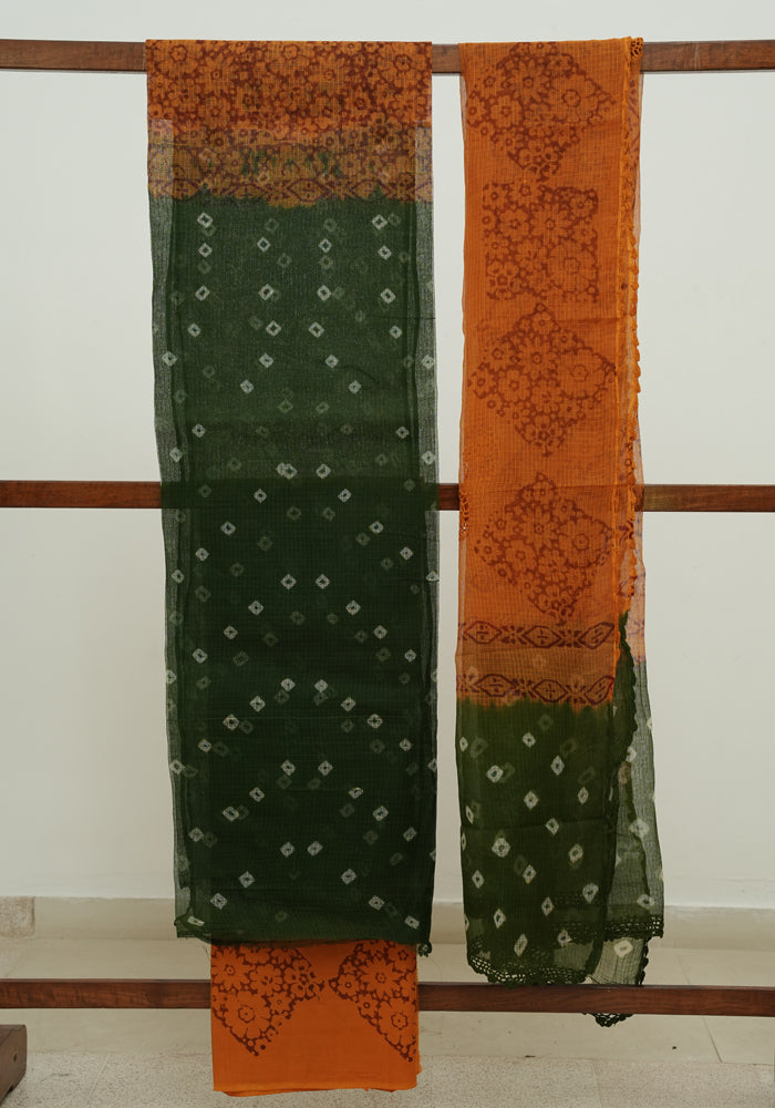 Green and Mango Yellow Unstitched Block Printed Kota Salwar Set With Bandini and Crochet Dupatta