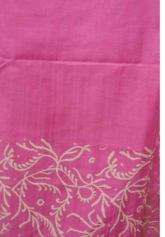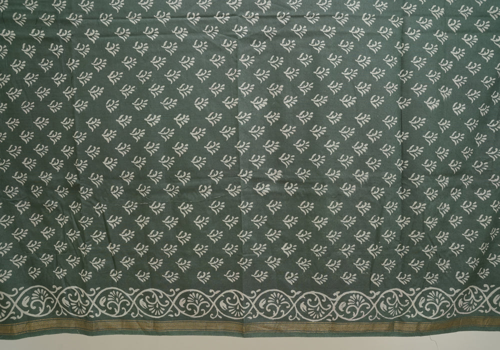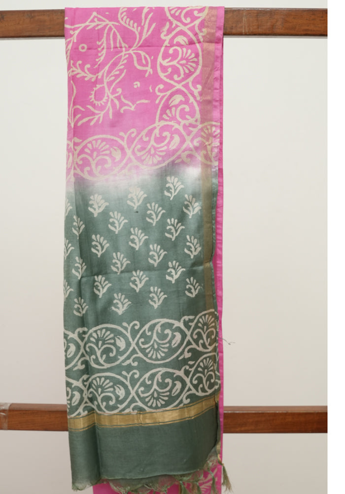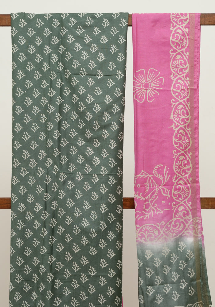 Green and Rani Pink Unstitched Blockprinted Muslin Chennur Silk Salwar Set