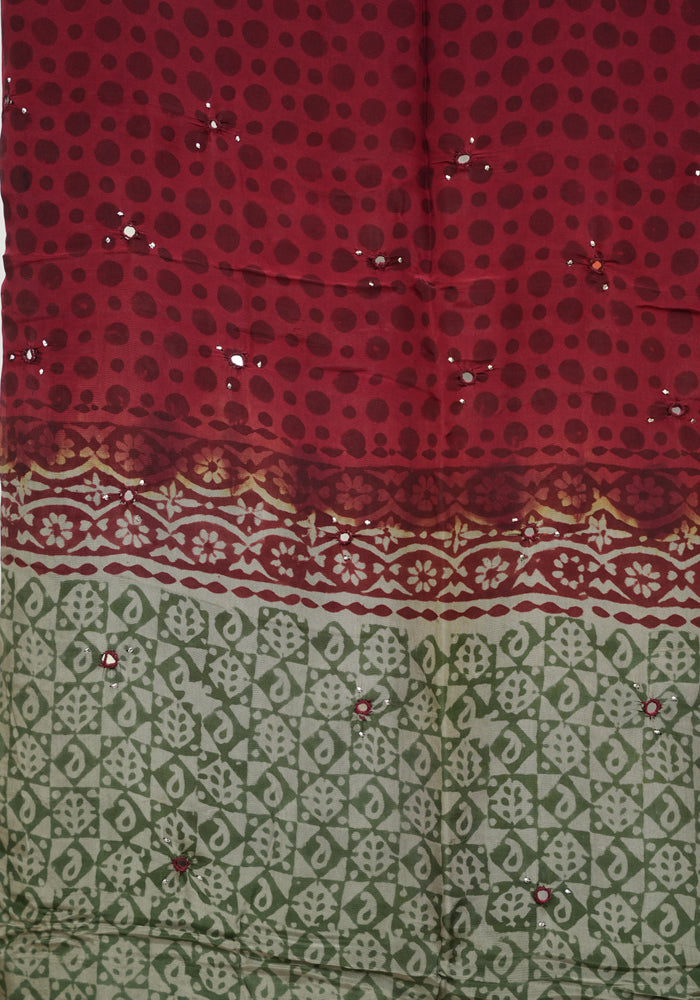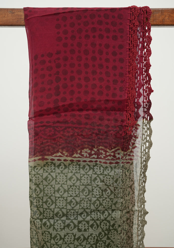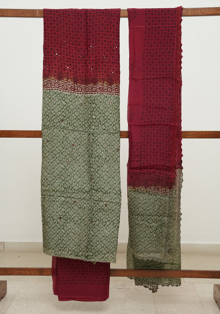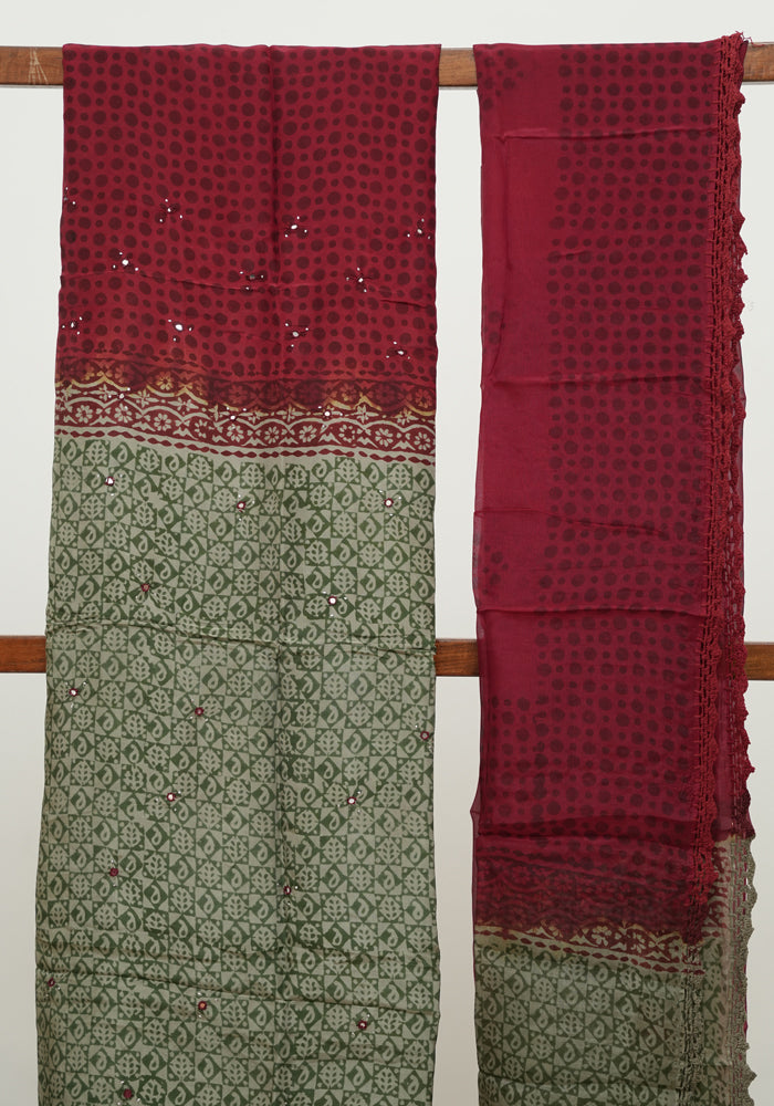 Greenish Grey and Maroon Unstitched Blockprinted Semi Organza Salwar Set With Crochet Dupatta