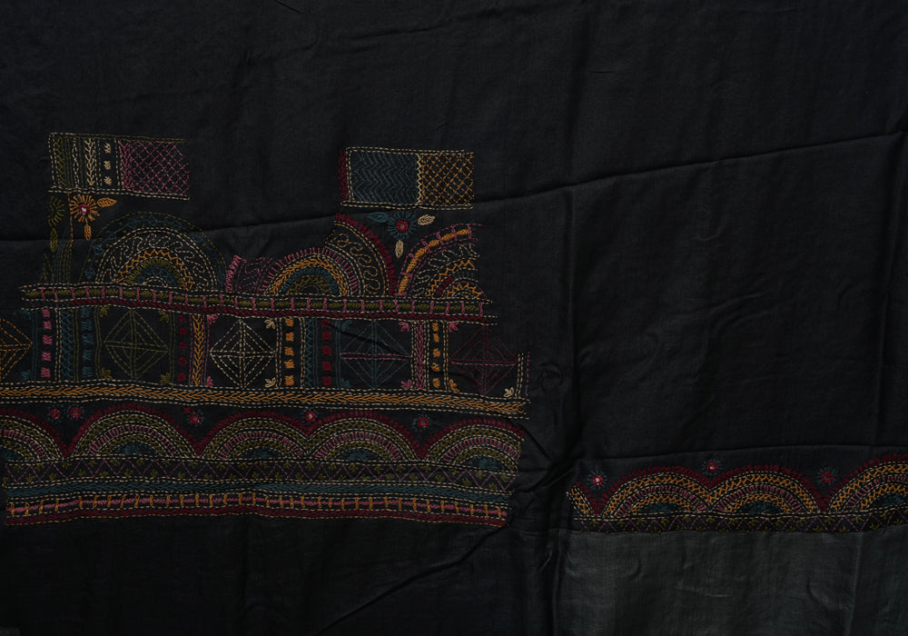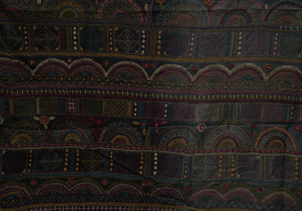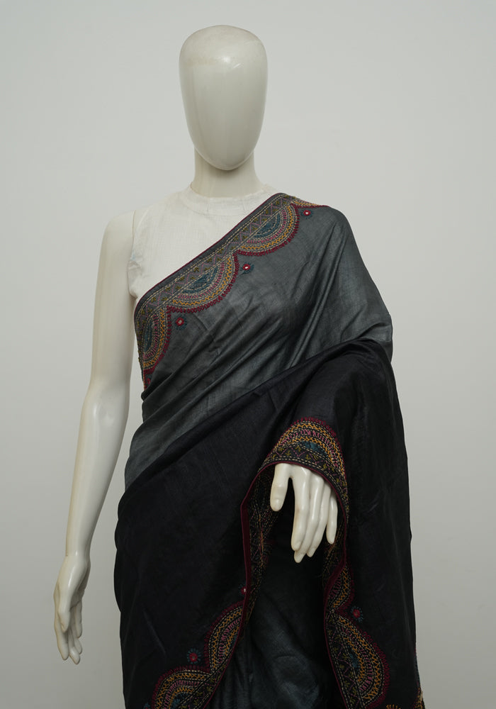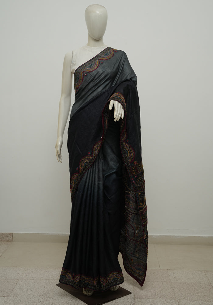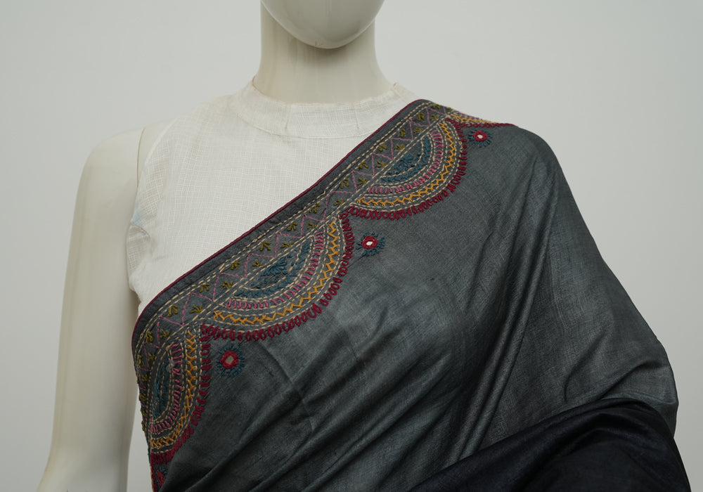 Grey and Black Tussar Silk Saree with Lambani Embroidery is OUT OF STOCK currently and available on pre-payment only. Order now for delivery within 2 weeks.