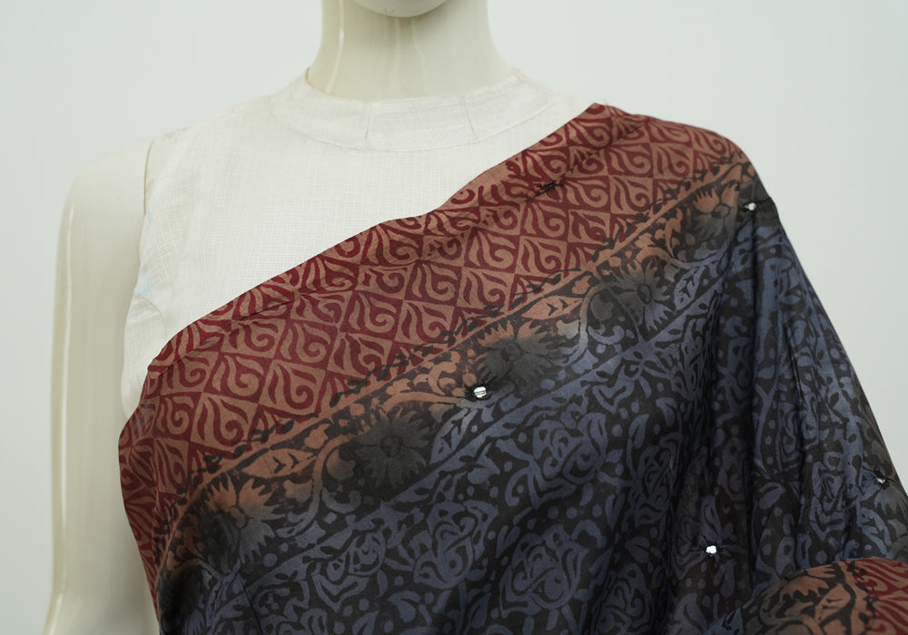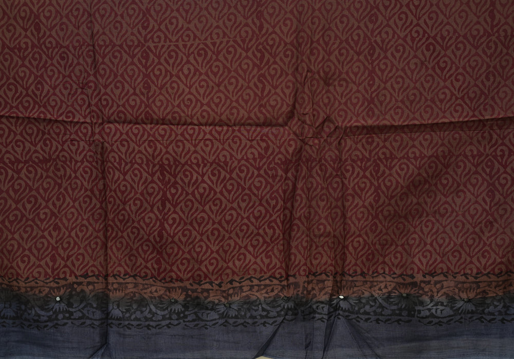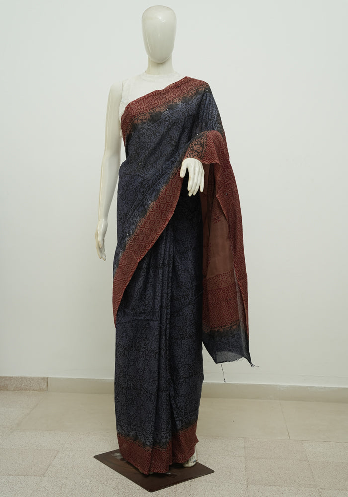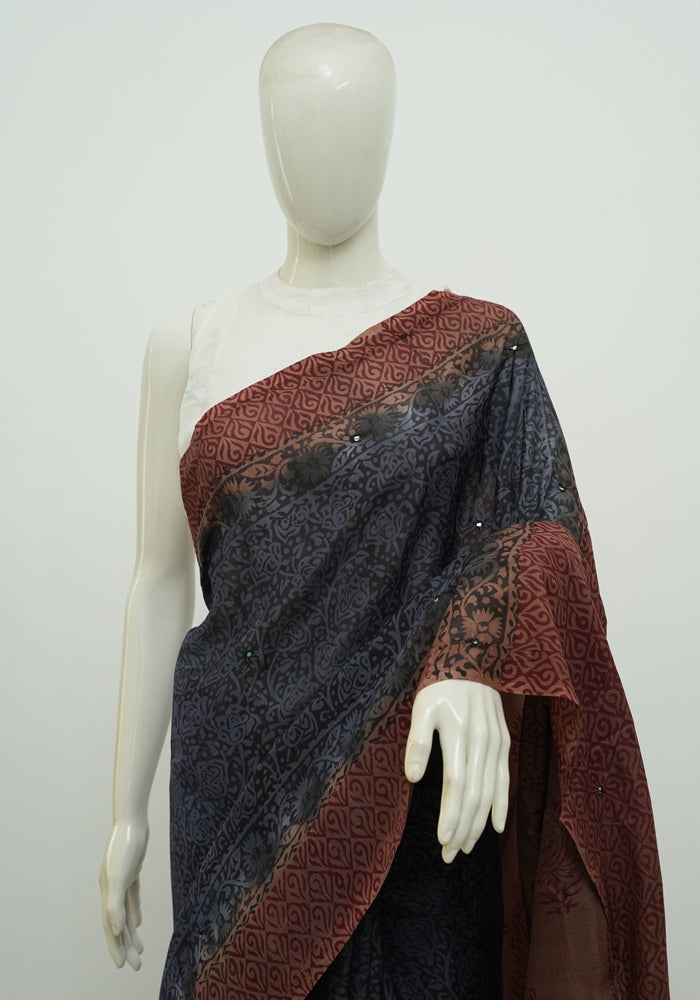 Grey and Brown Block Printed Chennur Silk Saree with Mirror Work is OUT OF STOCK currently and available on pre-payment only. Order now for delivery within 2 weeks.
