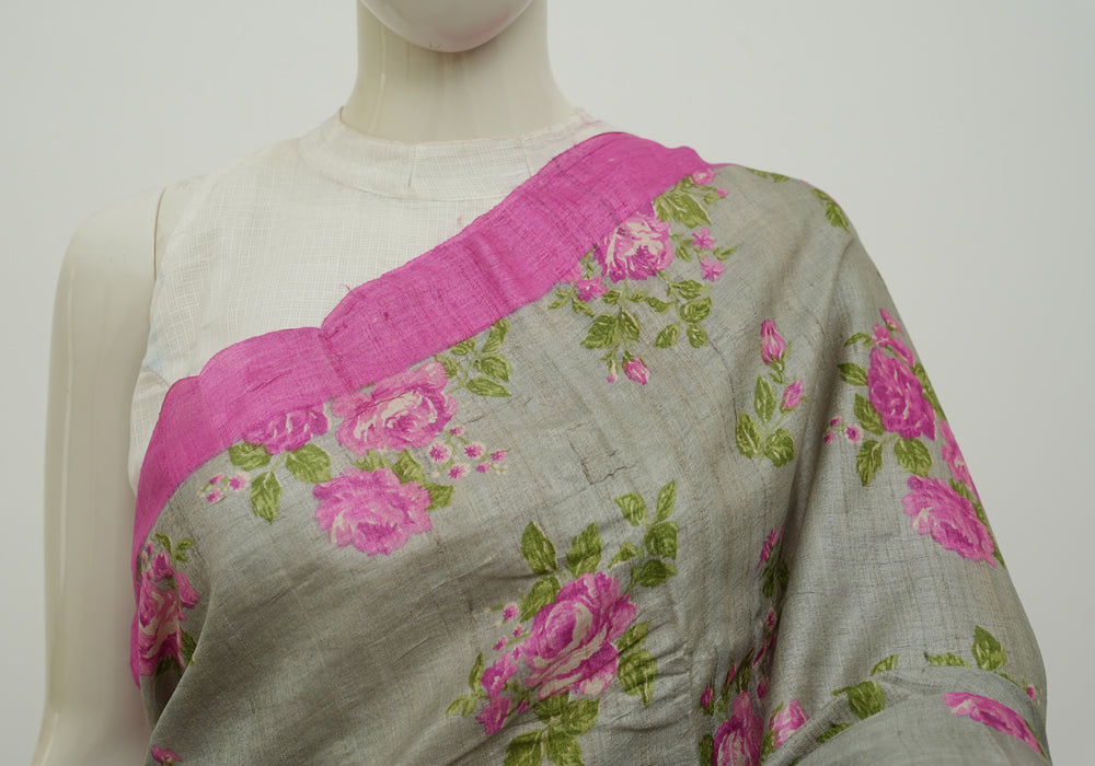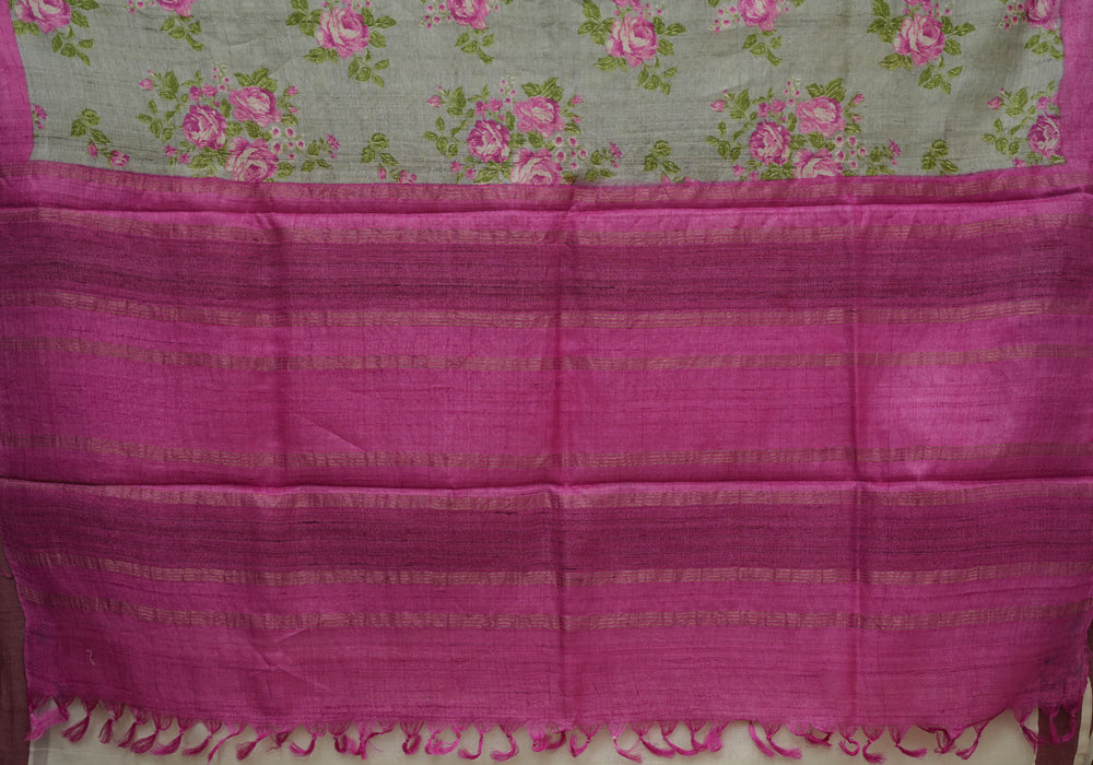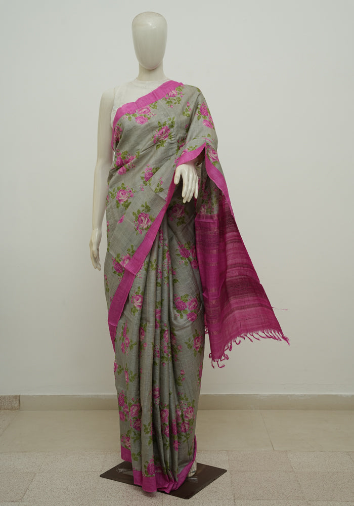 Grey and Pink Tussar Silk Saree is OUT OF STOCK currently and available on pre-payment only. Order now for delivery within 2 weeks.