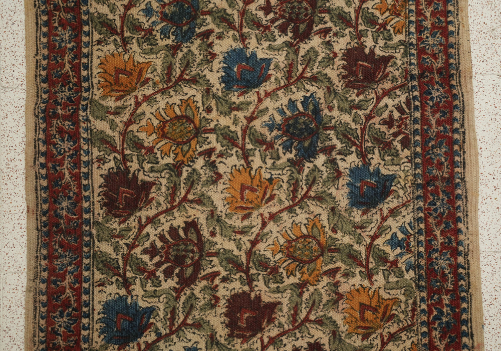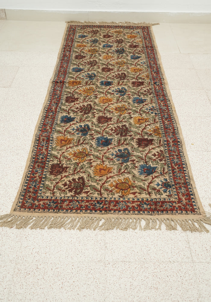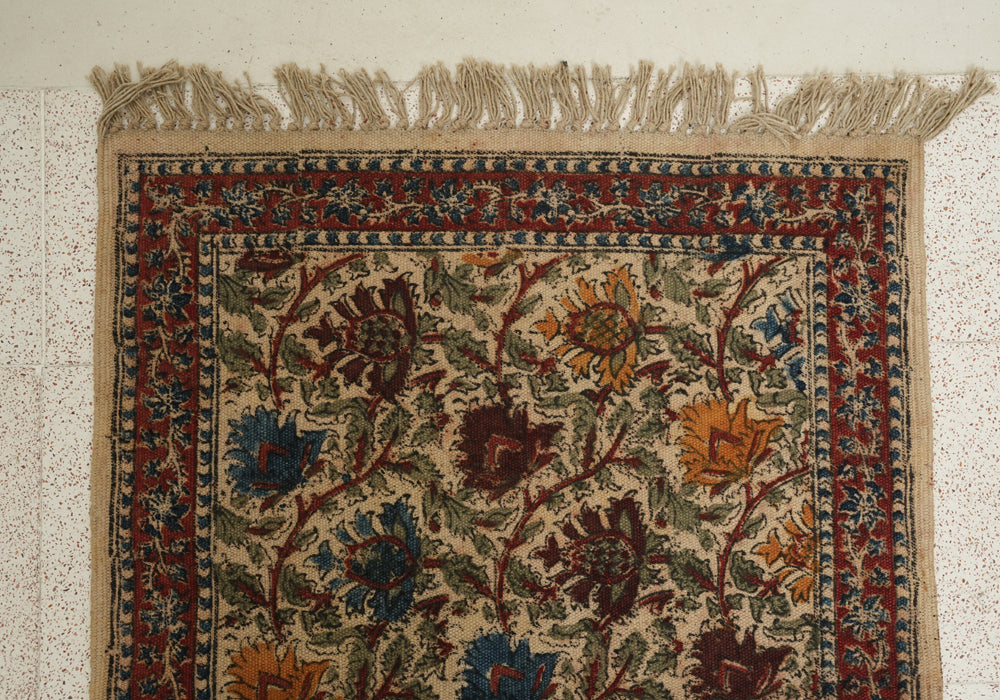 Handcrafted Handloom Cotton Dhurrie Carpet with Kalamkari hand blockprinted using natural dyes. This rug/Carpet adds a lovely ethnic touch to your space.