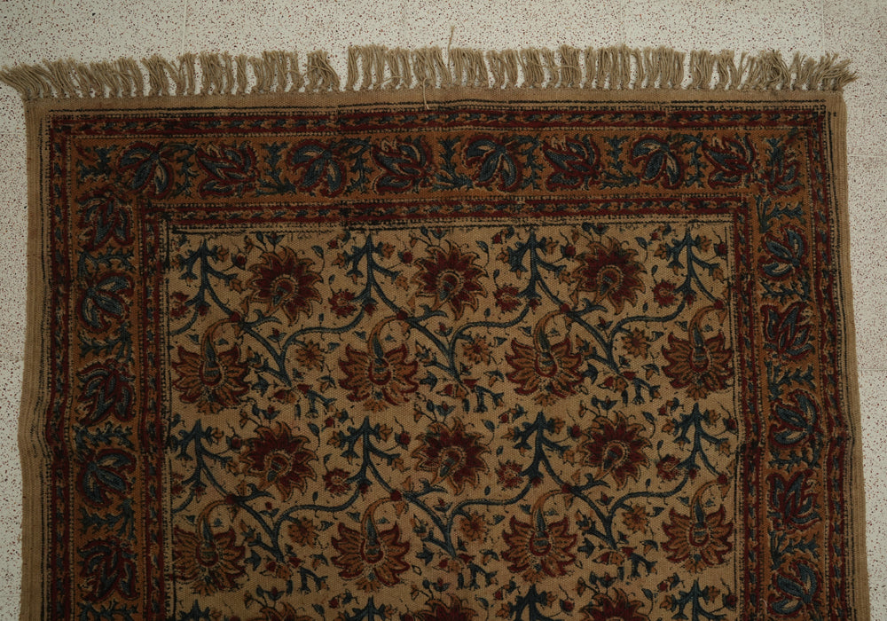 Handcrafted Handloom Cotton Dhurrie Carpet with Kalamkari hand blockprinted using natural dyes. This rug/Carpet adds a lovely ethnic touch to your space.