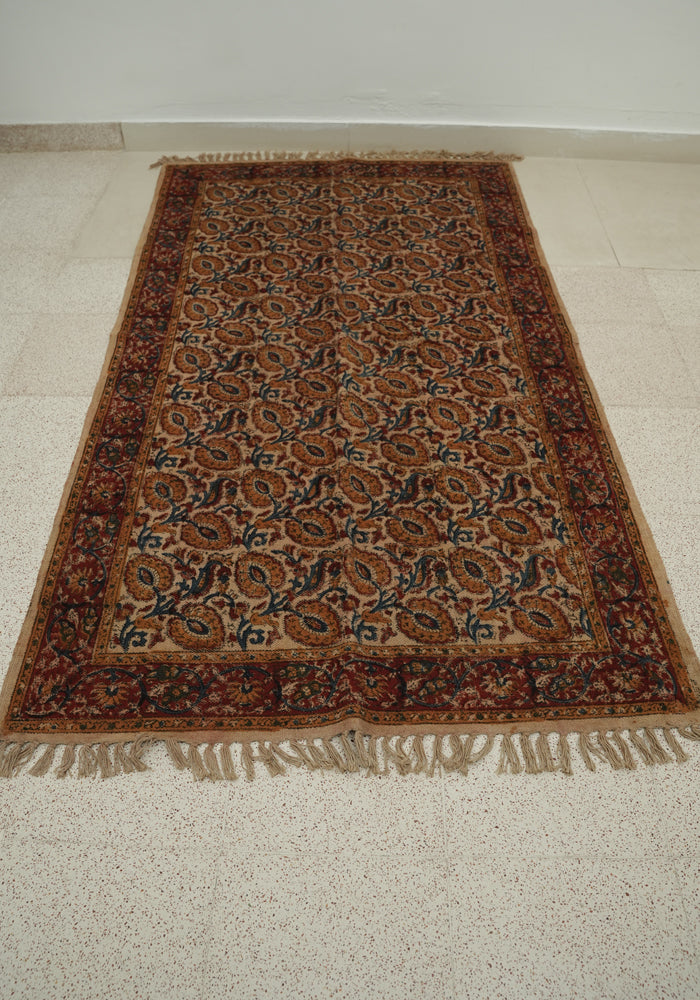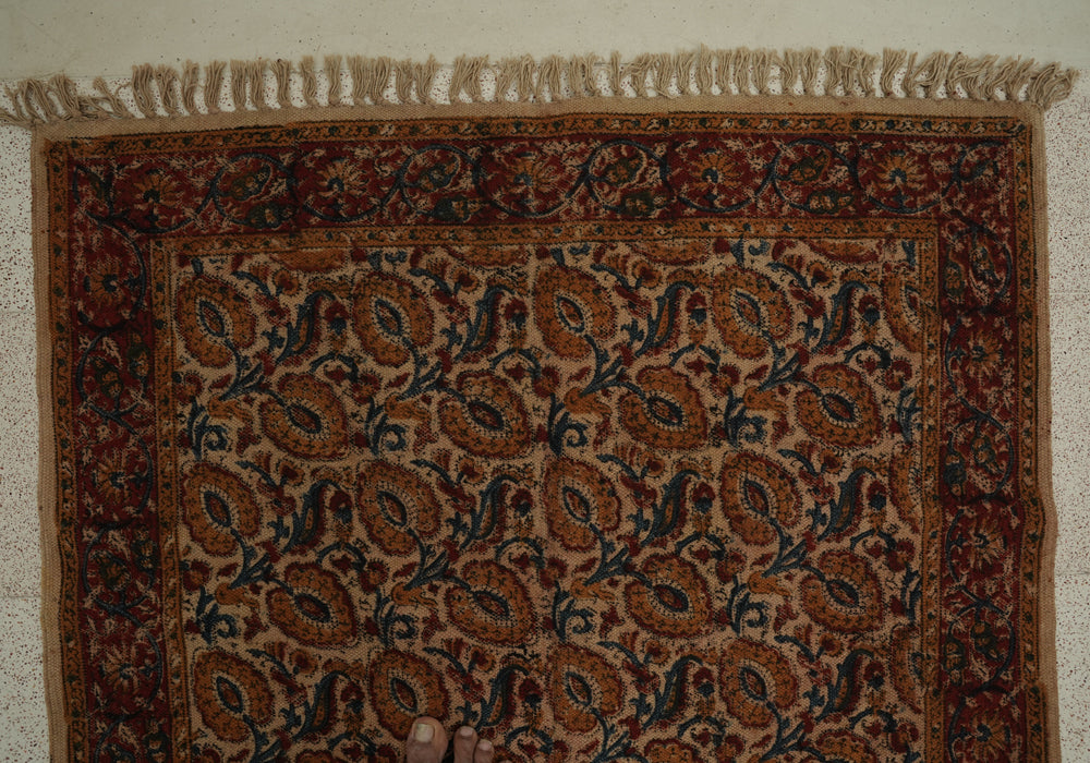 Handcrafted Handloom Cotton Dhurrie Carpet with Kalamkari hand blockprinted using natural dyes. This rug/Carpet adds a lovely ethnic touch to your space.