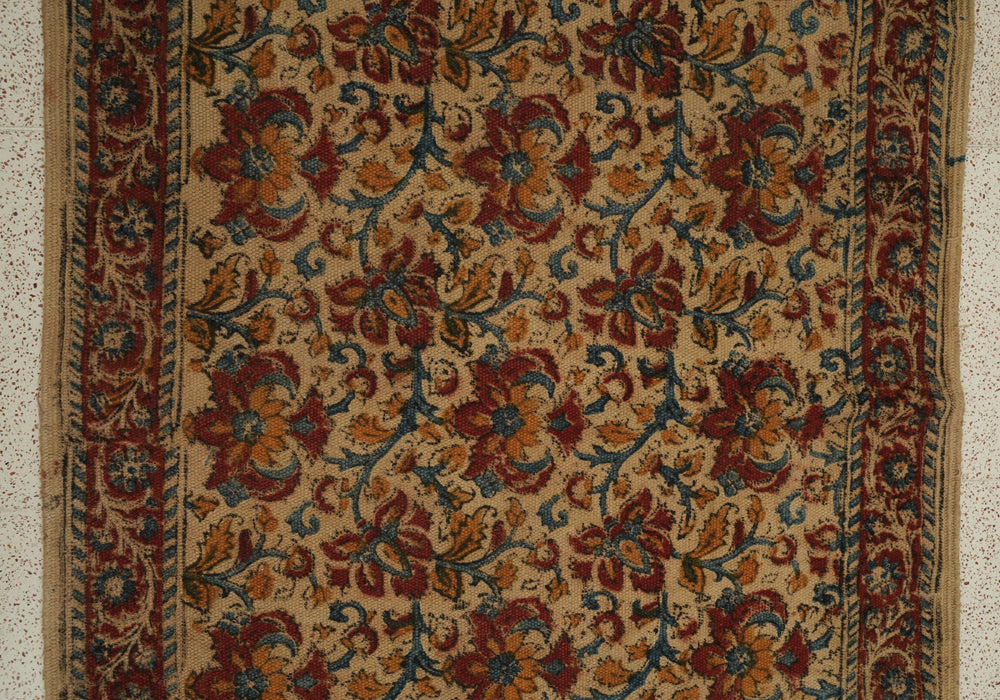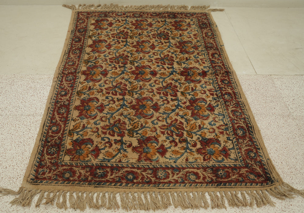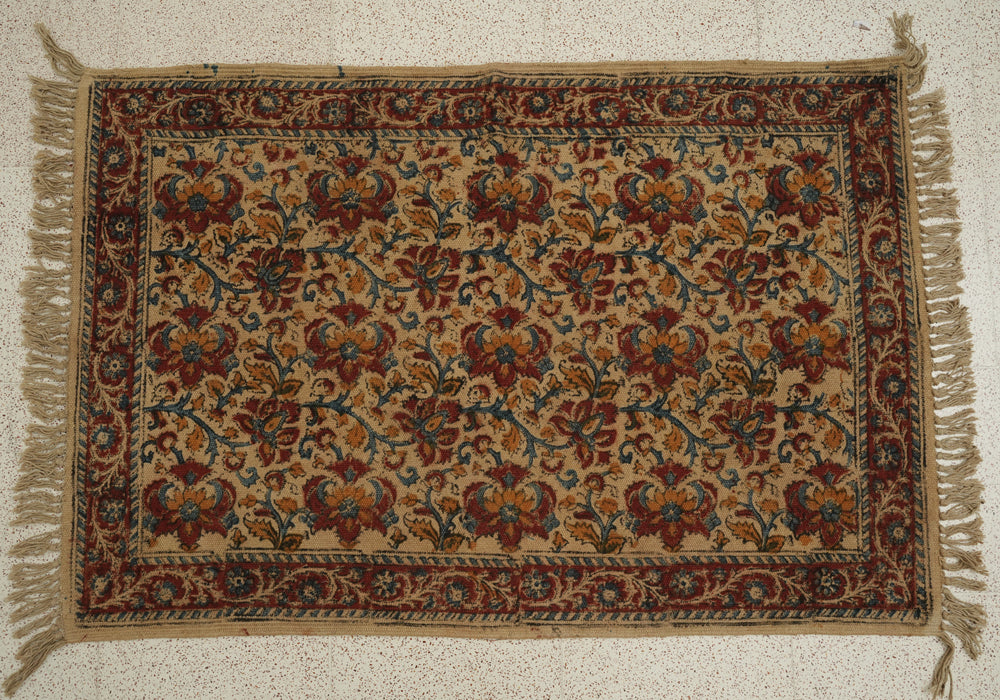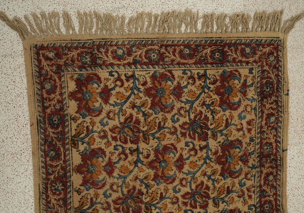 Handcrafted Handloom Cotton Dhurrie Carpet with Kalamkari hand blockprinted using natural dyes. This rug/carpet adds a lovely ethnic touch to your space.