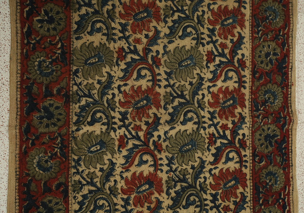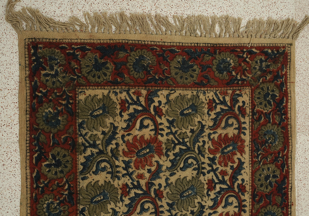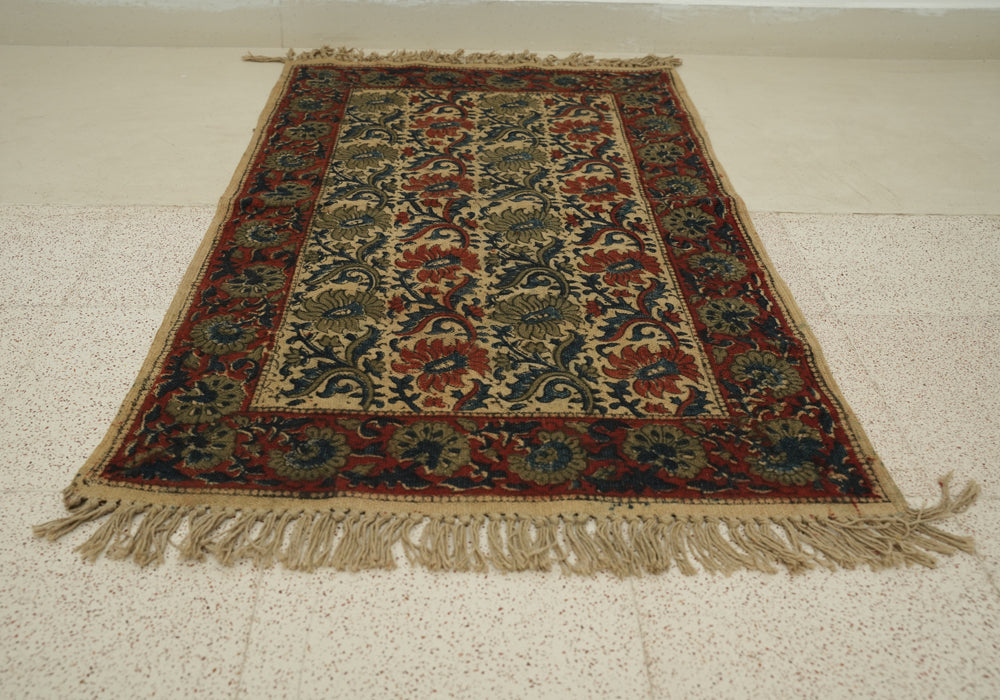 Handcrafted Handloom Cotton Dhurrie Carpet with Kalamkari hand blockprinted using natural dyes. This rug/carpet adds a lovely ethnic touch to your space.