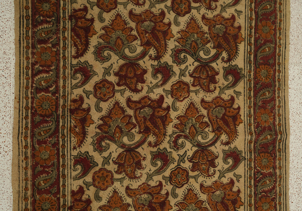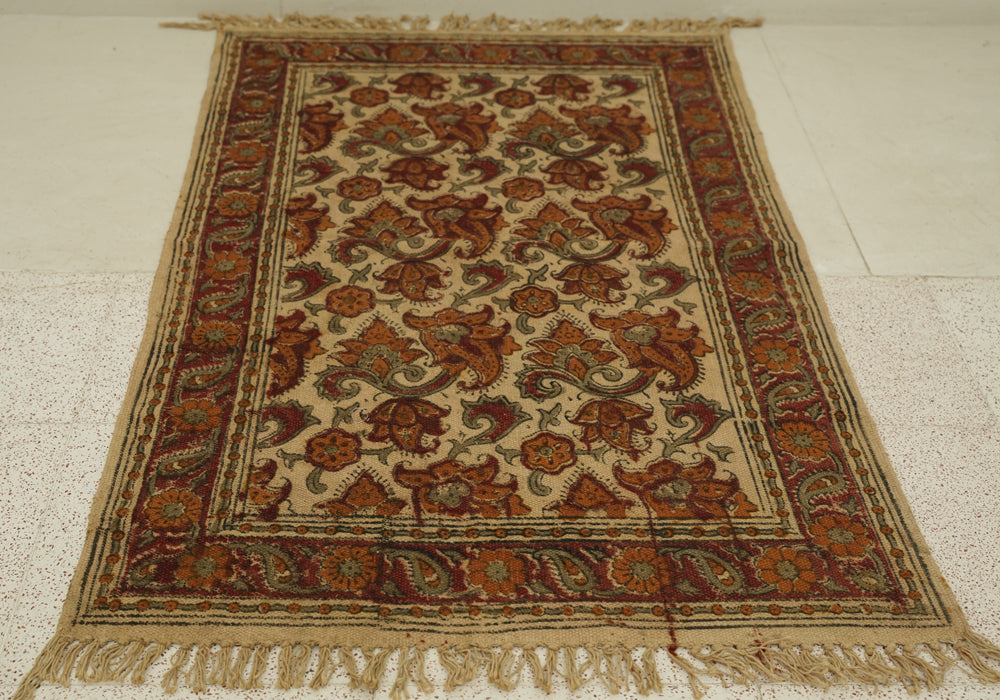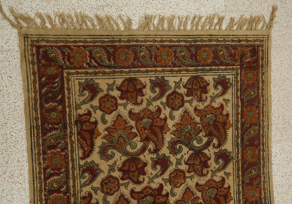 Handcrafted Handloom Cotton Dhurrie Carpet with Kalamkari hand blockprinted using natural dyes. This rug/carpet adds a lovely ethnic touch to your space.