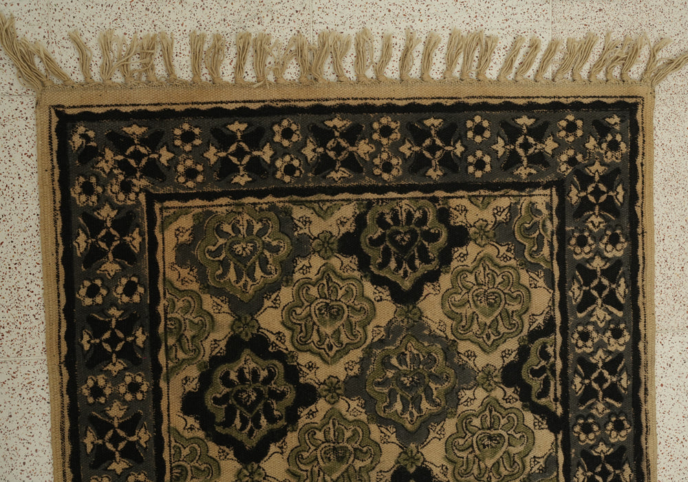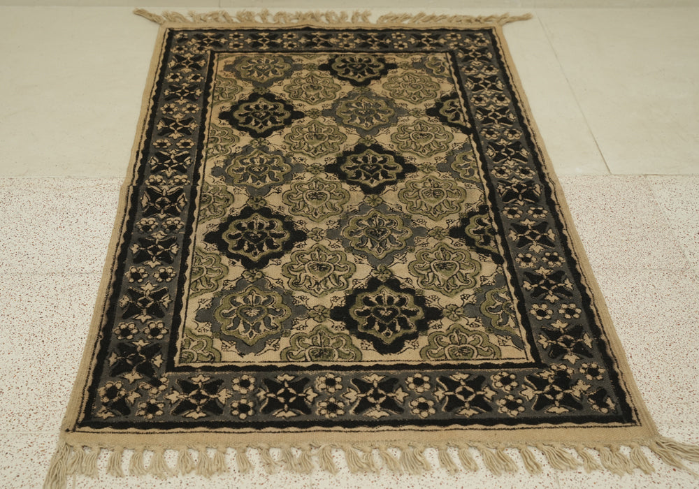 Handcrafted Handloom Cotton Dhurrie Carpet with Kalamkari hand blockprinted using natural dyes. This rug/carpet adds a lovely ethnic touch to your space.