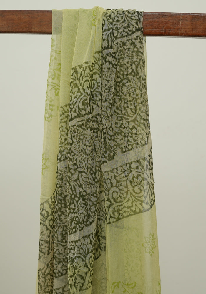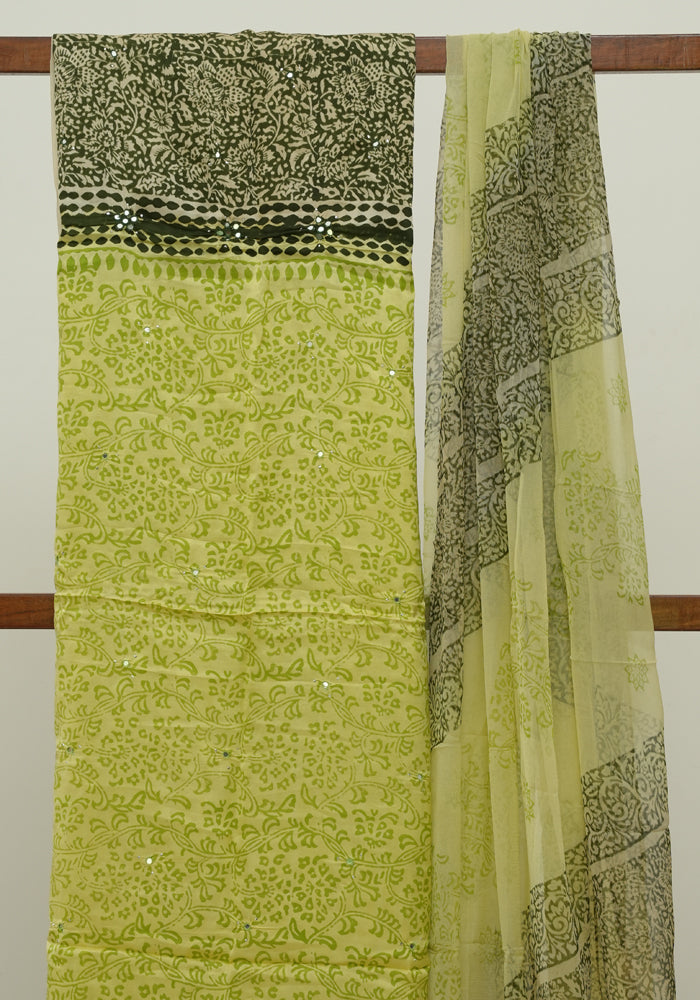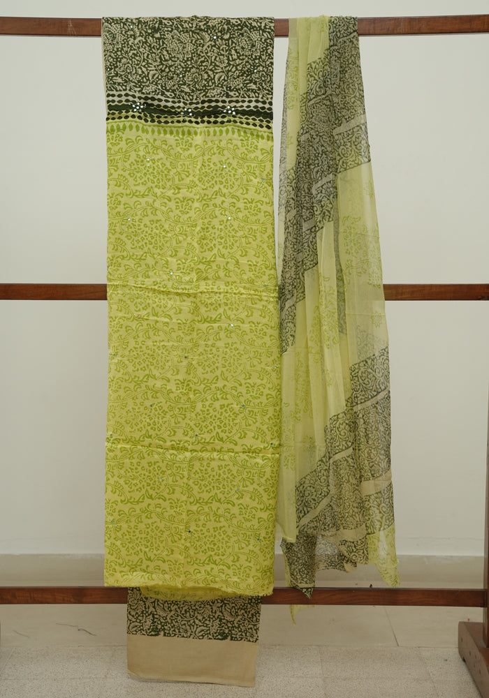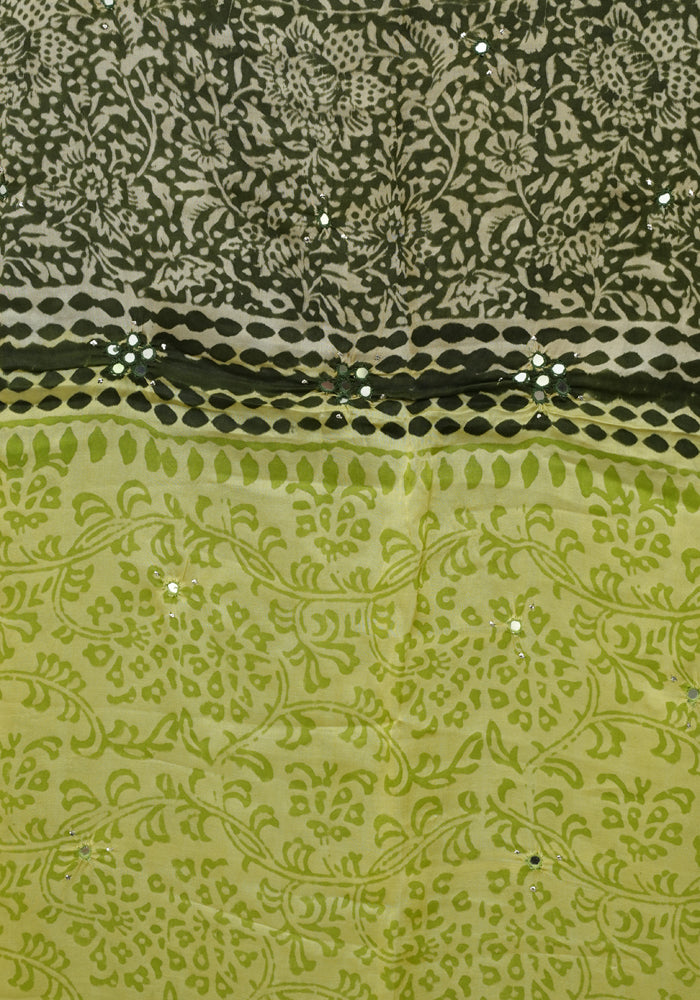 Lemon Yellow and Beige Modal Silk Block Printed Unstitched Salwar Set With Mirror and Badla Work