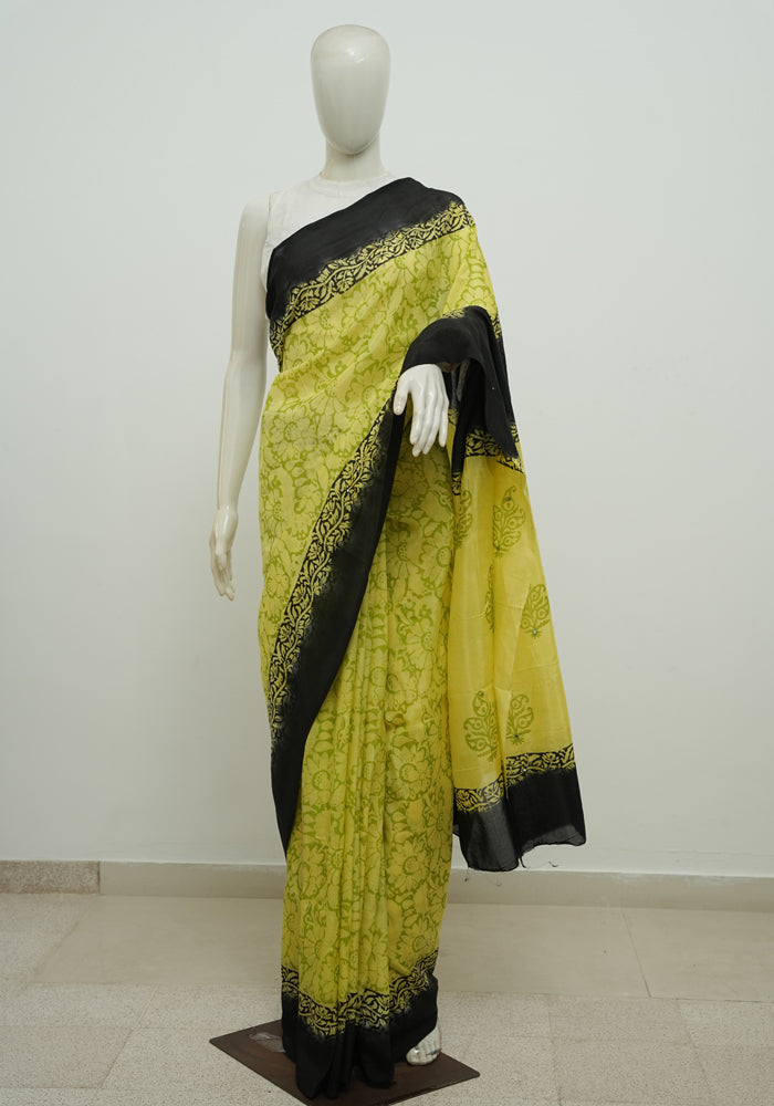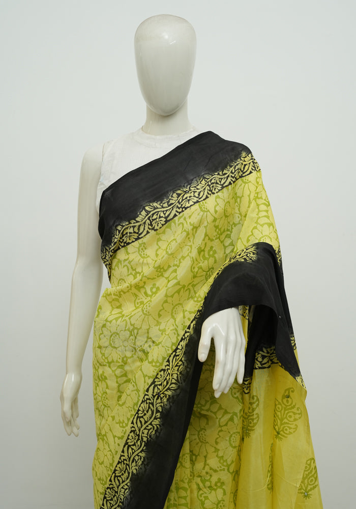 Lemon Yellow and Black Block Printed Chennur Silk Saree with Mirror Work