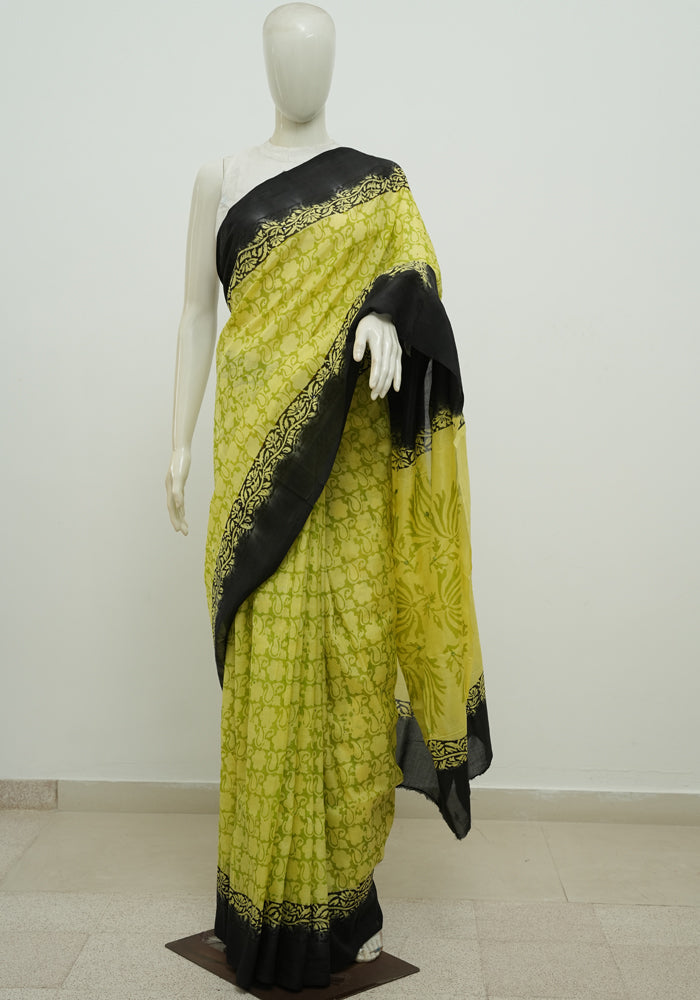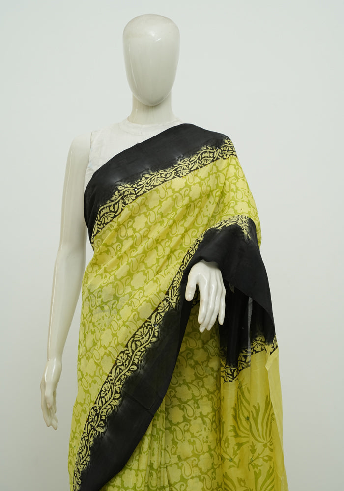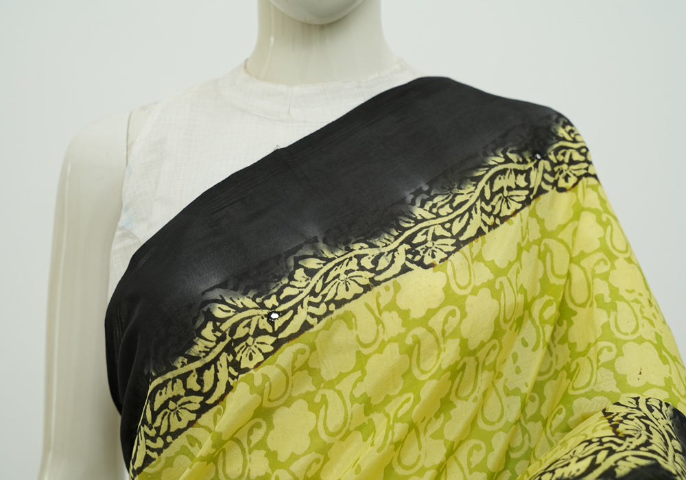 Lemon Yellow and Black Block Printed Chennur Silk Saree with Mirror Work