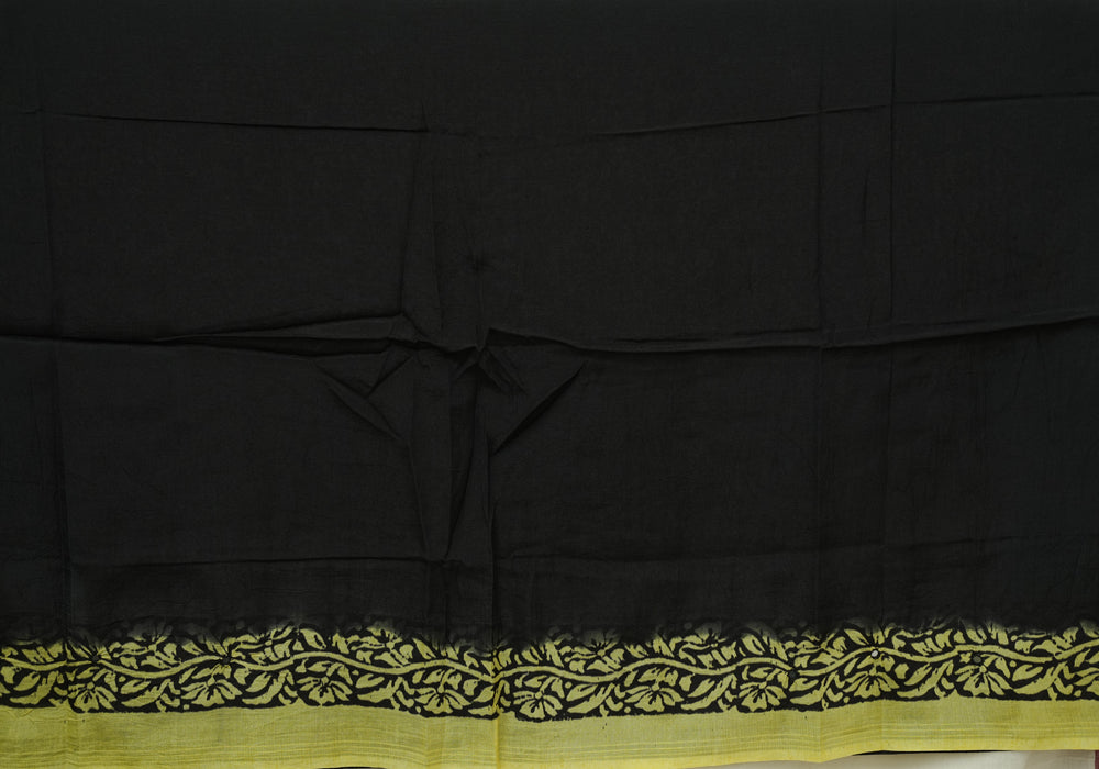 Lemon Yellow and Black Block Printed Chennur Silk Saree with Mirror Work is OUT OF STOCK currently and available on pre-payment only. Order now for delivery within 2 weeks.