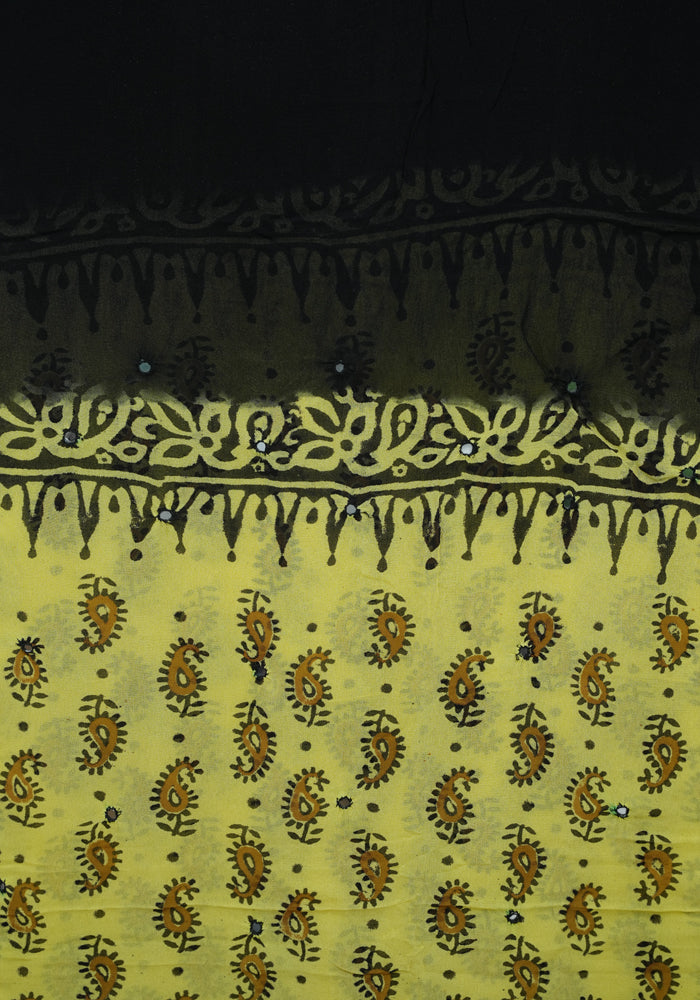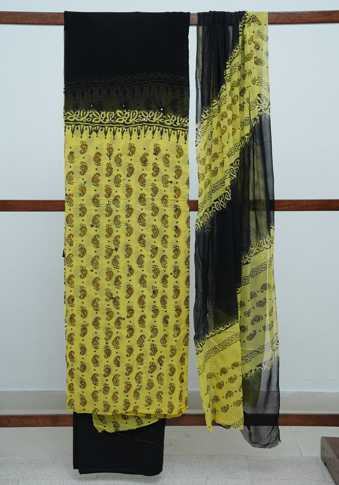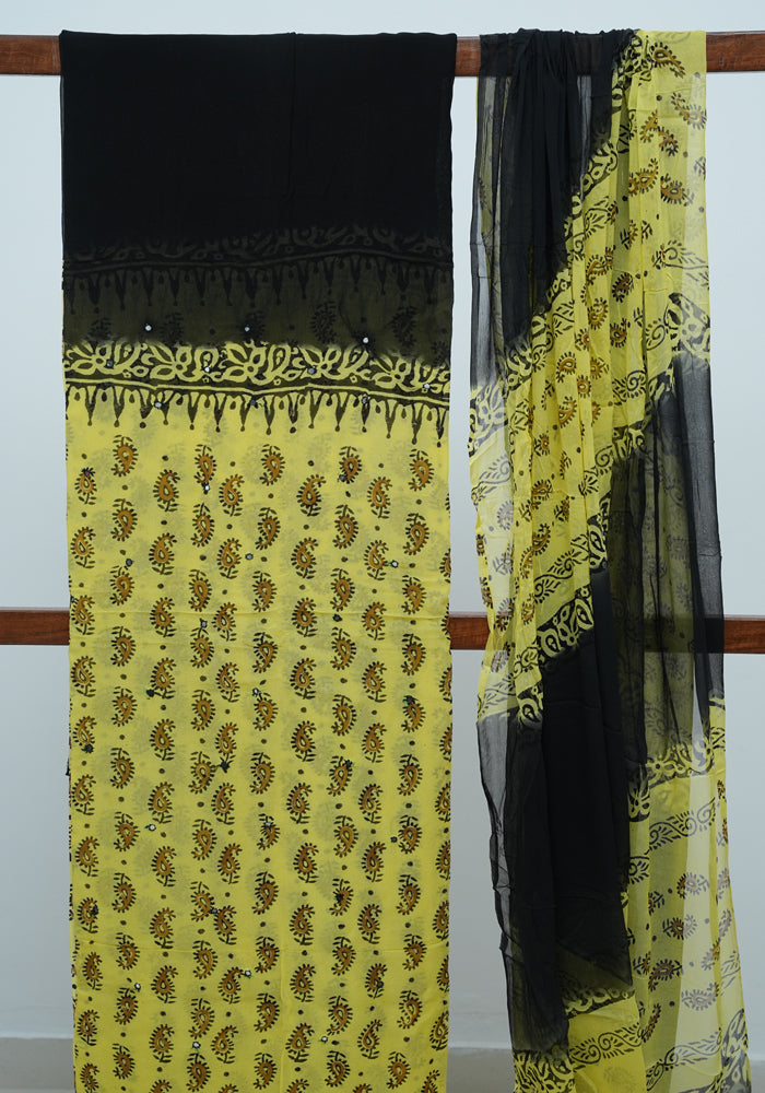 Lemon Yellow and Black Unstitched Georgette Salwar Set with Mirror Work is OUT OF STOCK currently and available on pre-payment only. Order now for delivery within 2 weeks.