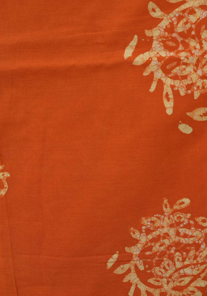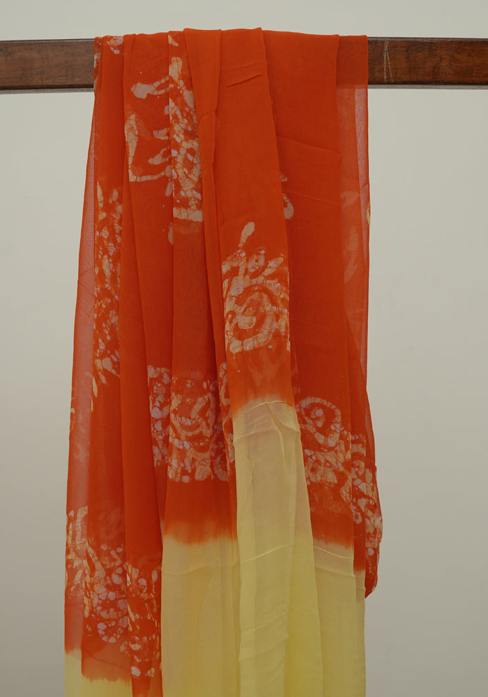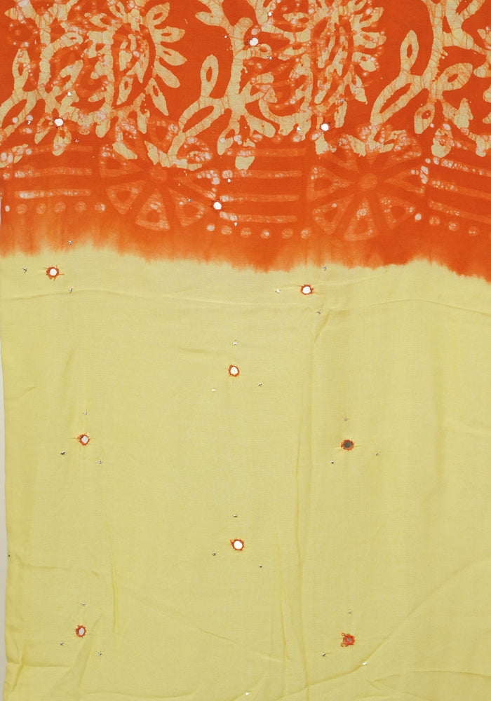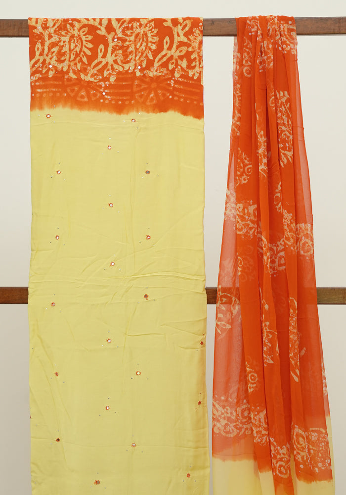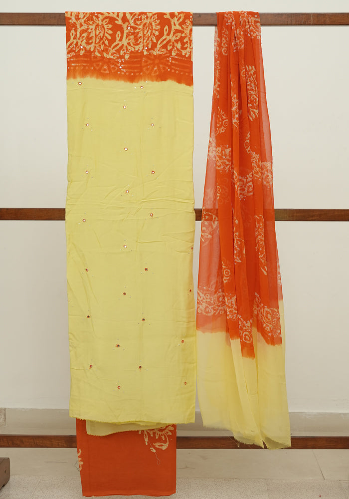 Lemon Yellow and Orange Batik Unstitched Muslin Chennur Silk Salwar Set With Mirror and Badla Work