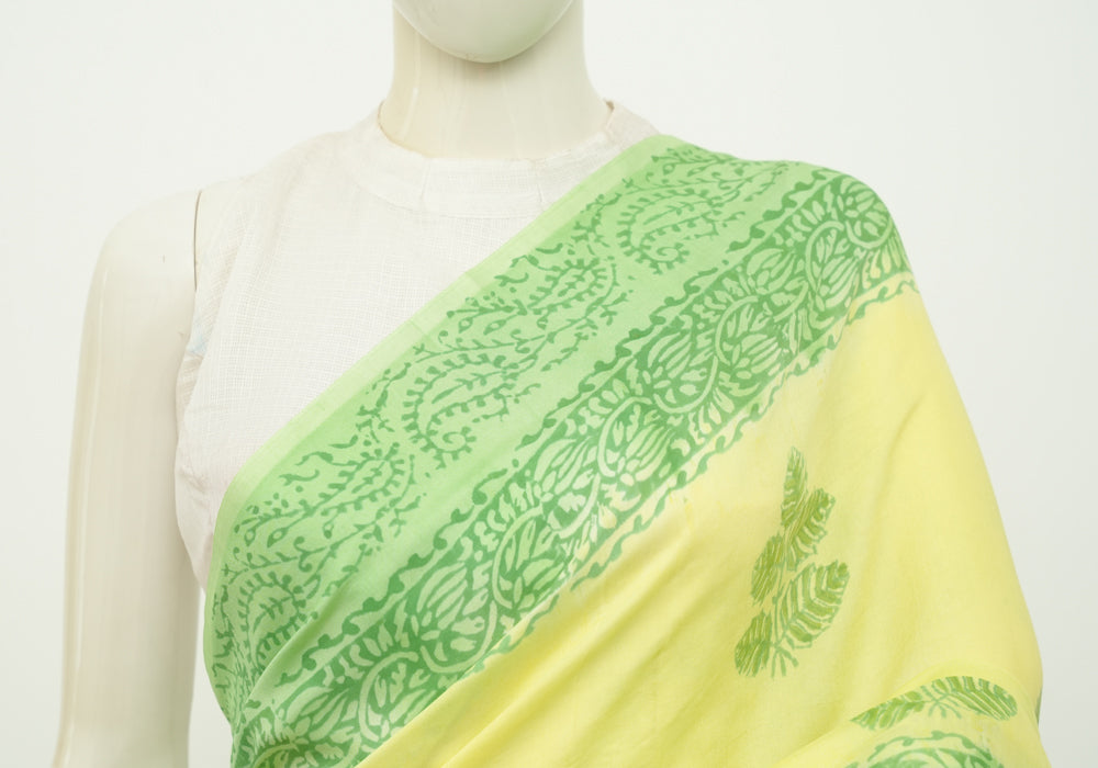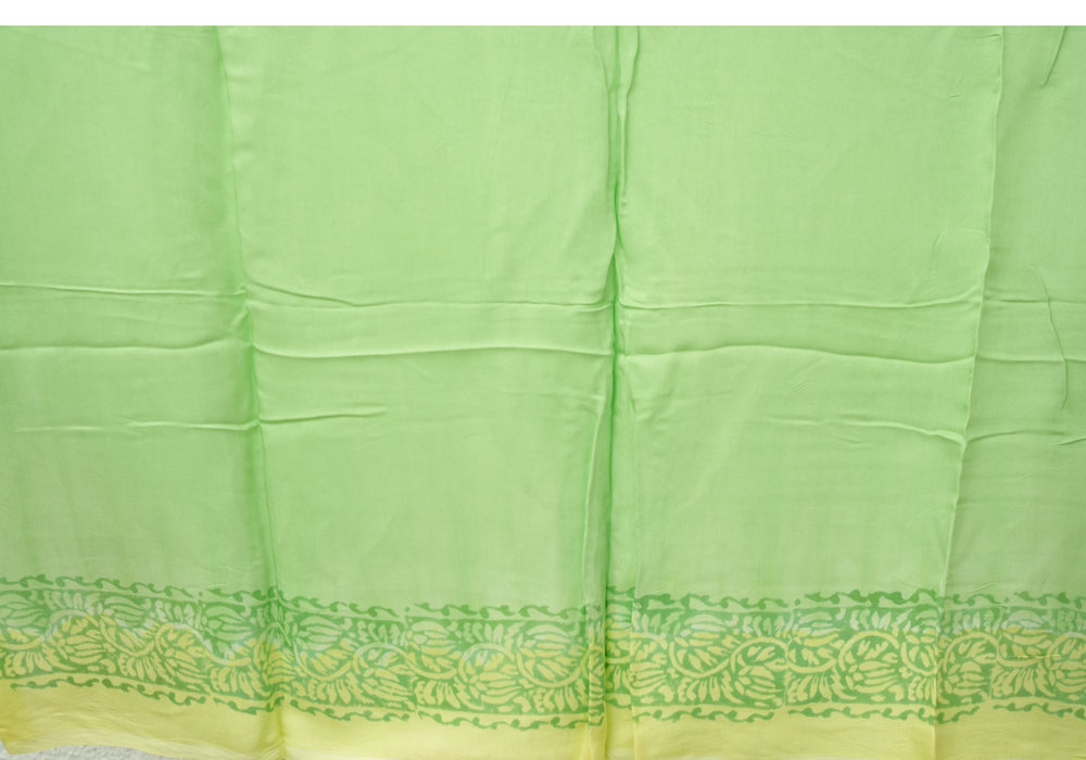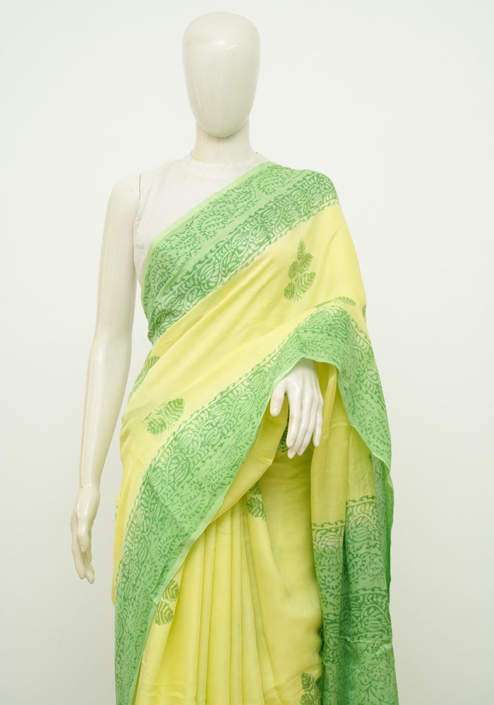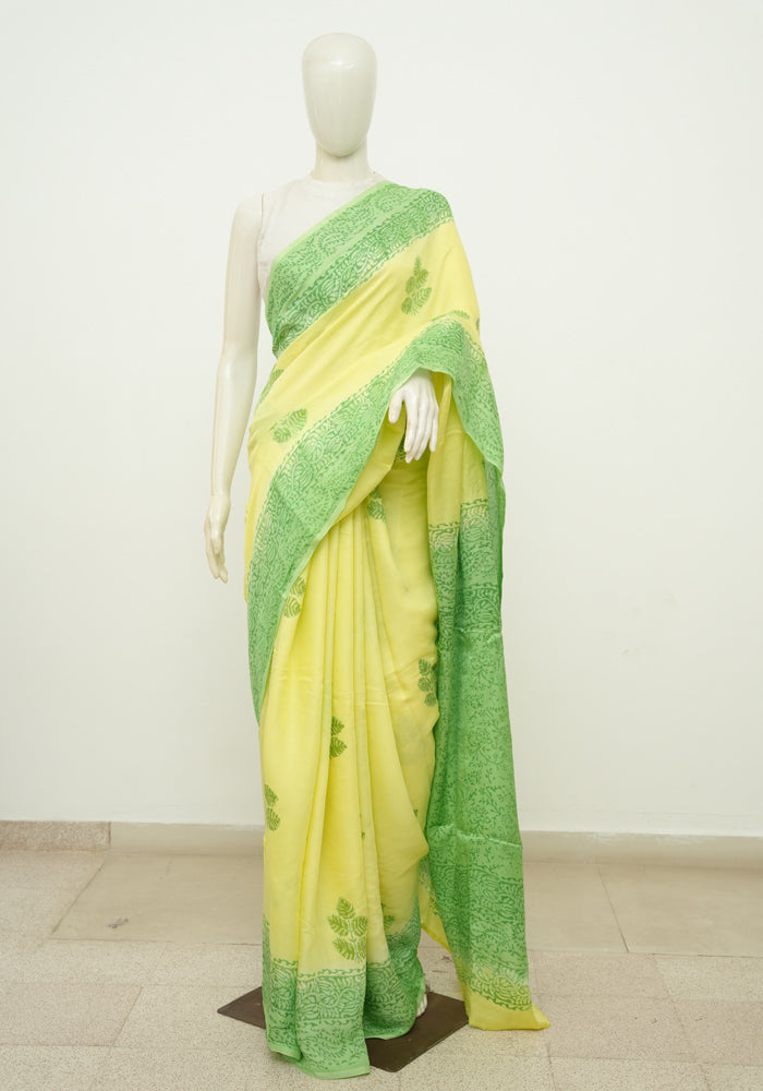 Lemon Yellow and Parrot Green Block Printed Modal Silk saree
