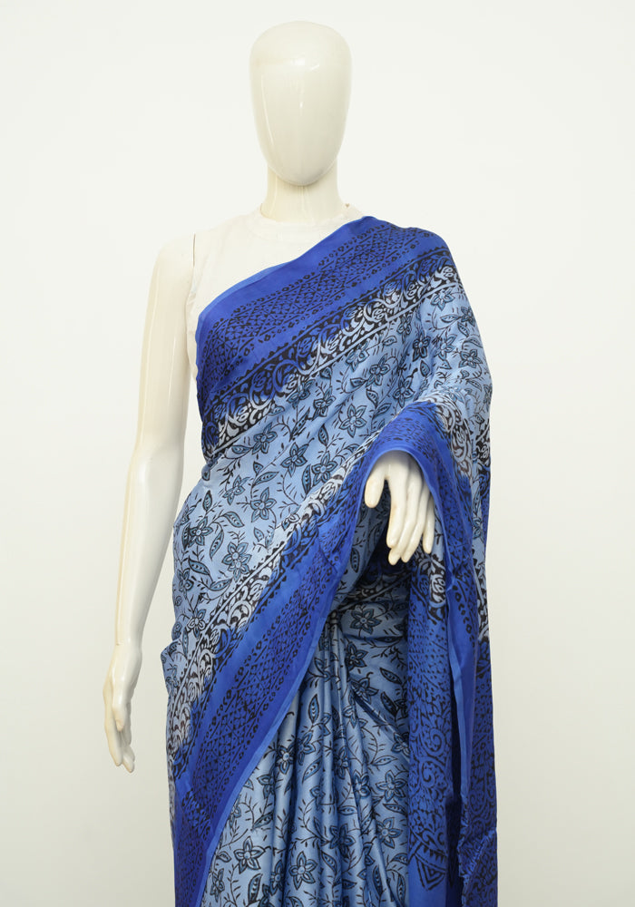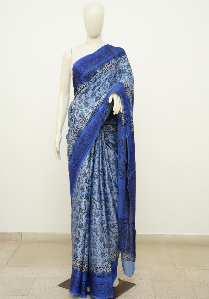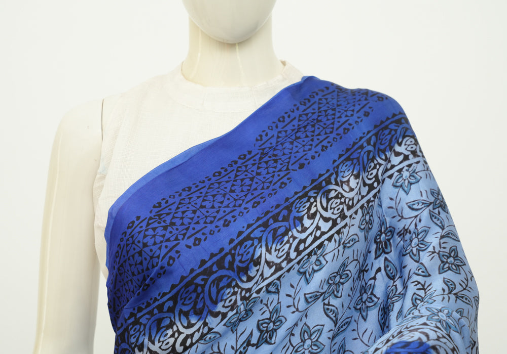 Light Blue and Blue Block Printed Modal Silk saree