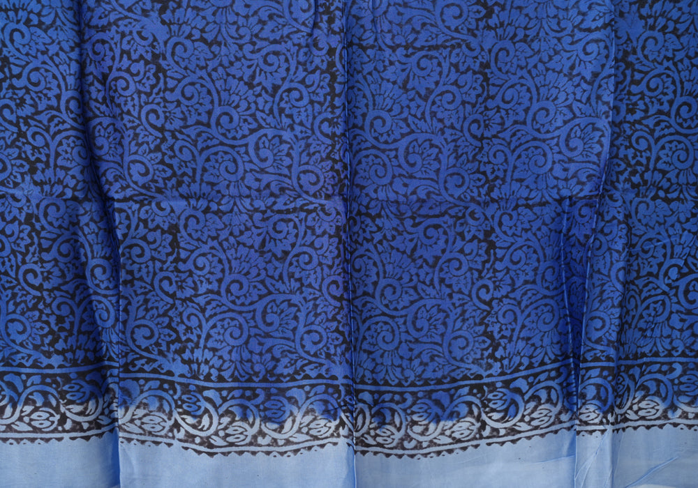 Light Blue and Blue Block Printed Modal Silk saree is OUT OF STOCK currently and available on pre-payment only. Order now for delivery within 2 weeks.