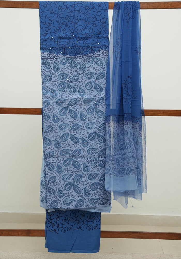 Light Blue and Blue Unstitched Cotton Salwar Set With Mirror Work
