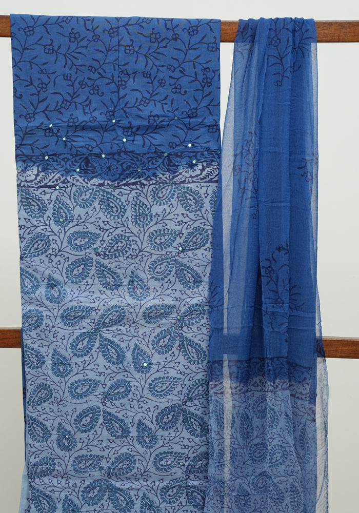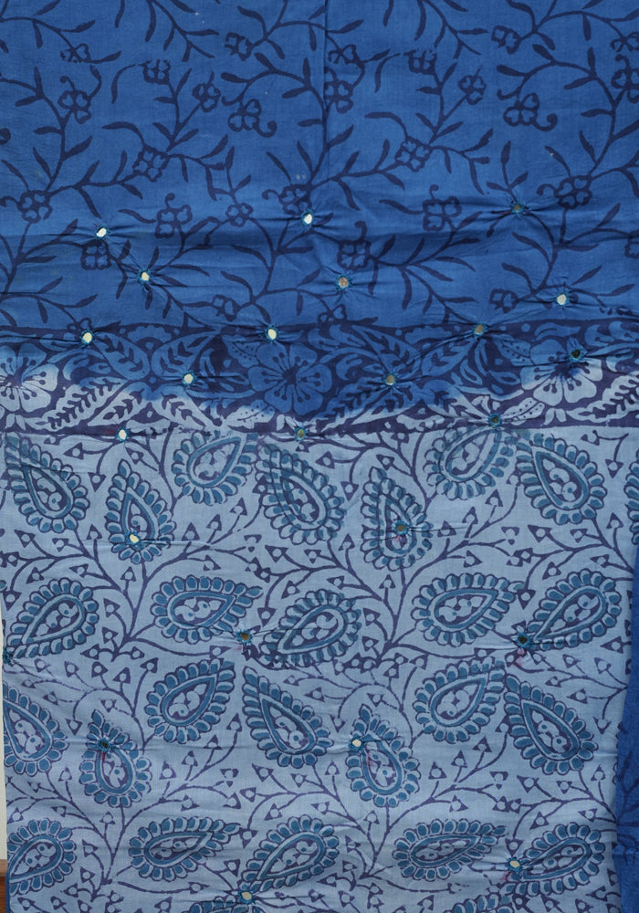 Light Blue and Blue Unstitched Cotton Salwar Set With Mirror Work is OUT OF STOCK currently and available on pre-payment only. Order now for delivery within 2 weeks.