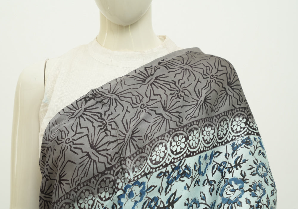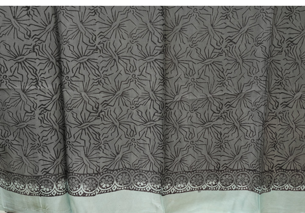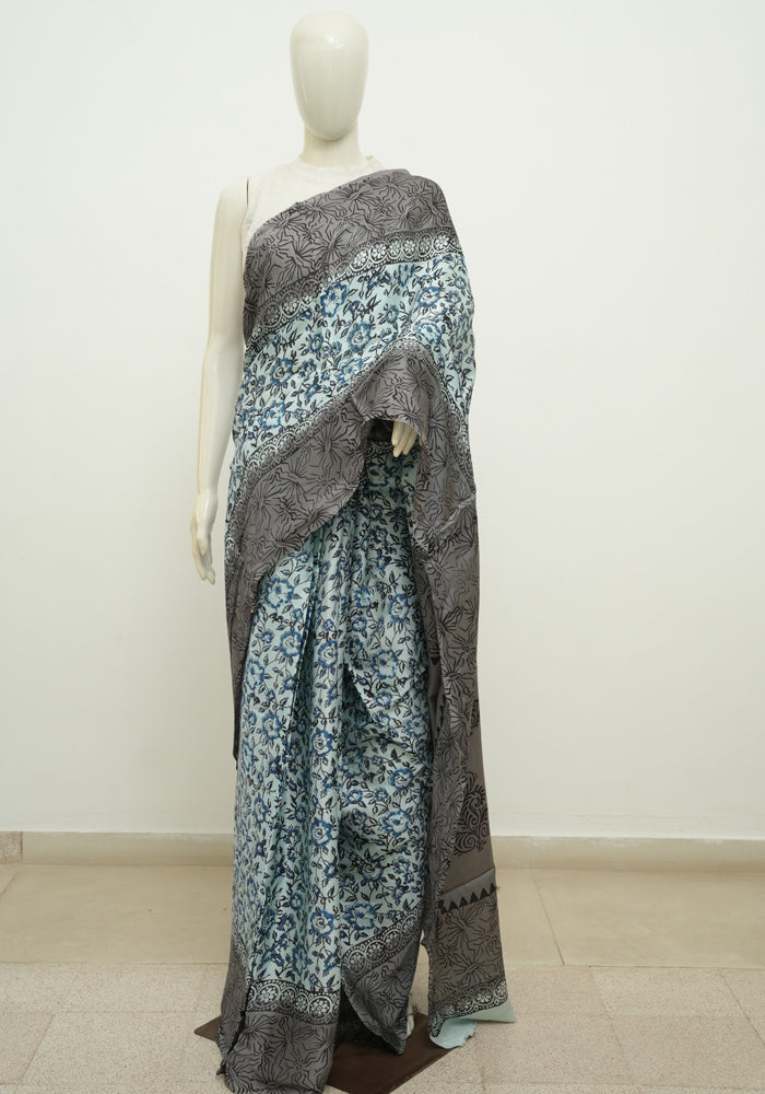 Light Blue and Grey Block Printed Modal Silk saree
