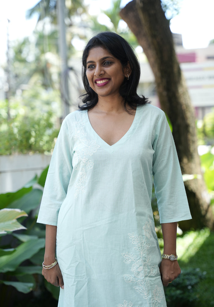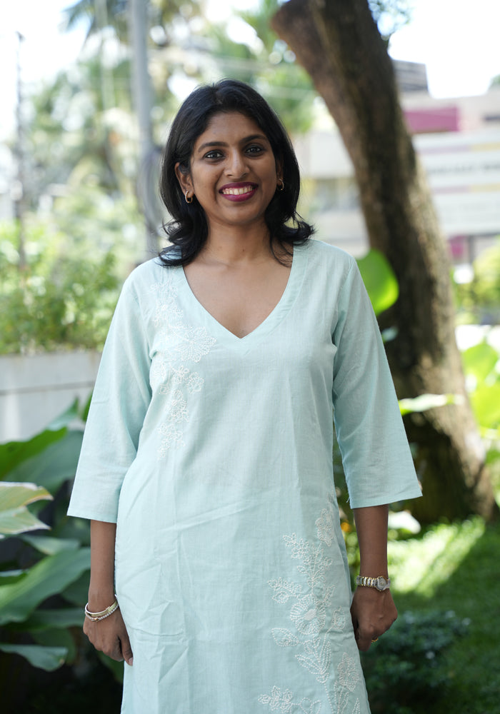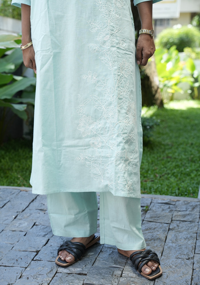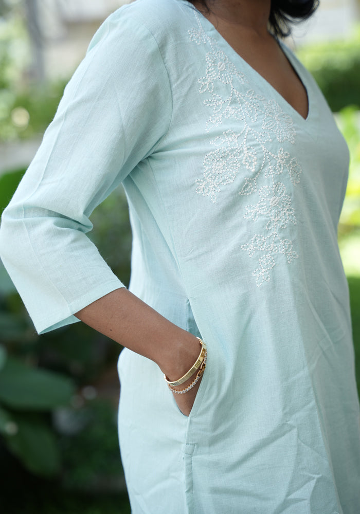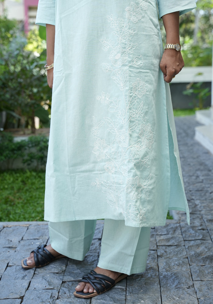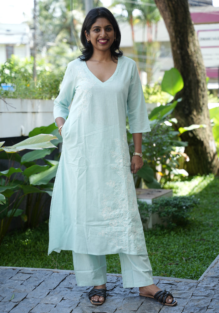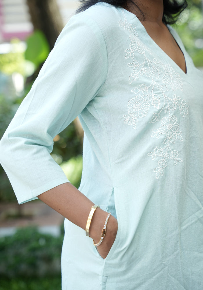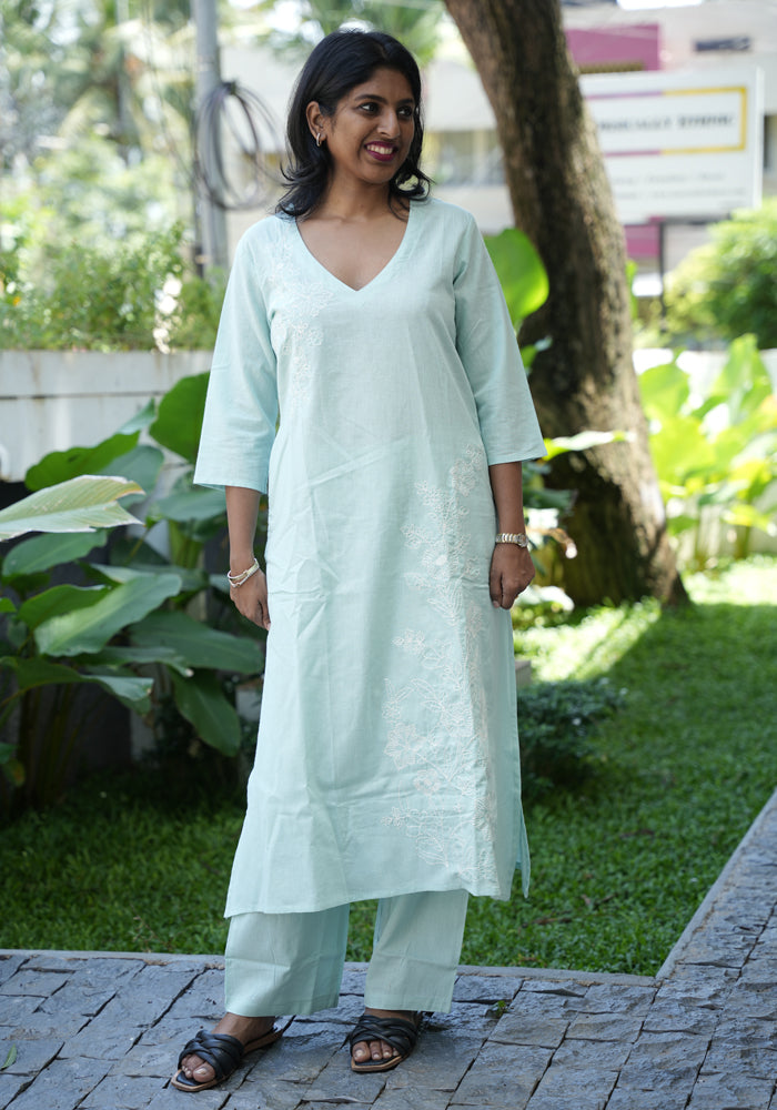This pure cotton embroidered co-ord set is perfect for everyday wear. The top has embroidery and three fourth sleeves and the bottom is plain.