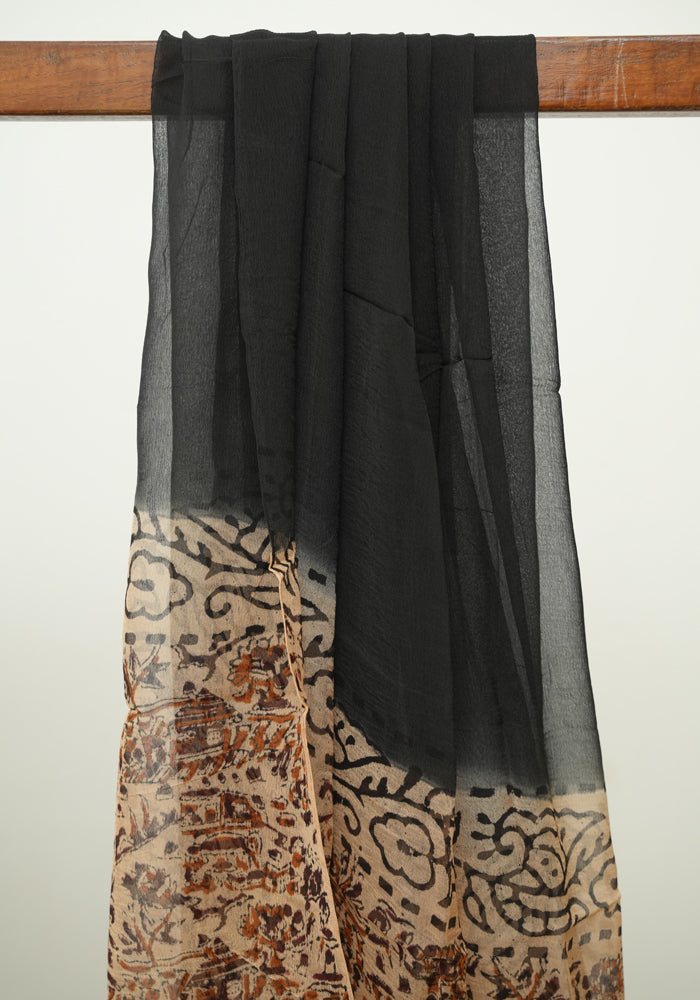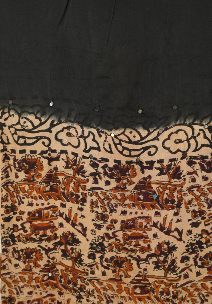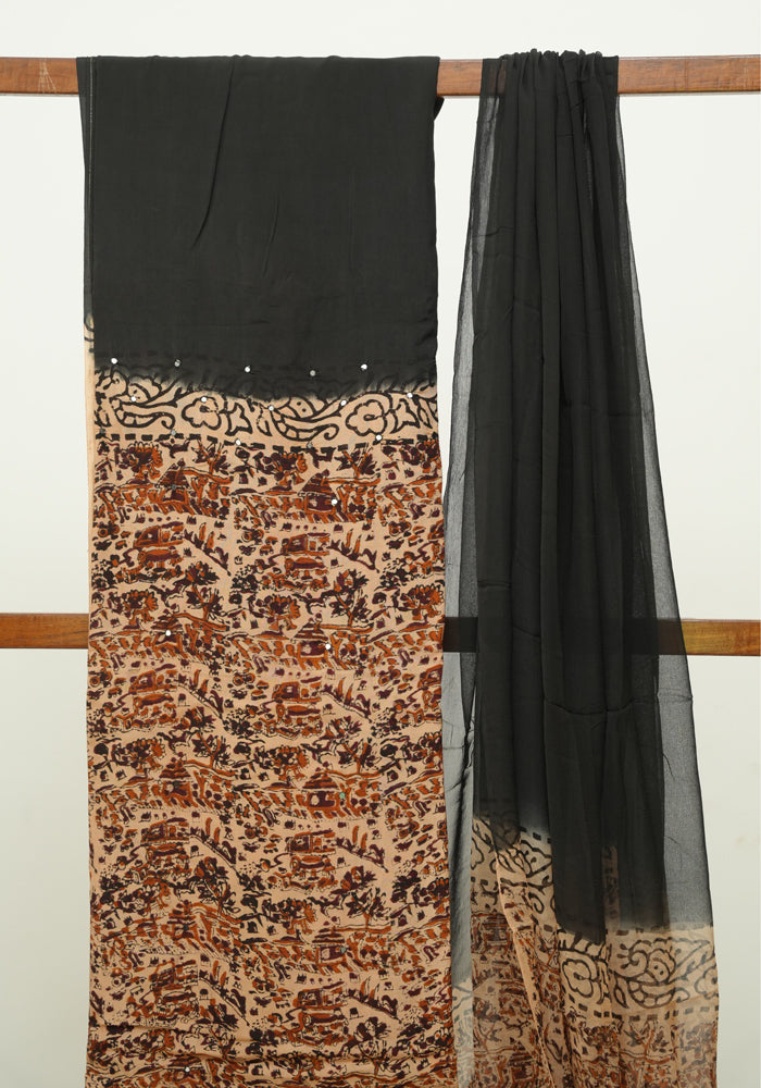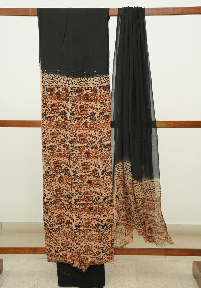 Light Brown and Black Unstitched Kalamkari Block Printed Muslin Salwar Set with Mirror Work