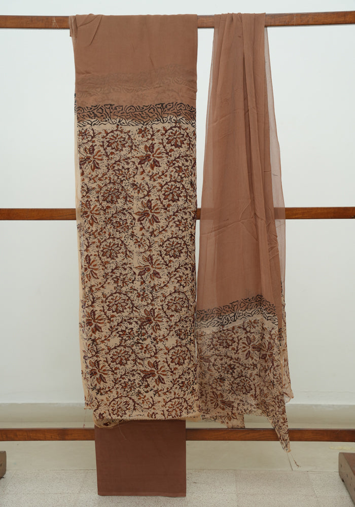 Light Brown and Brown Unstitched Blockprinted Georgette Salwar Set is OUT OF STOCK currently and available on pre-payment only. Order now for delivery within 2 weeks.