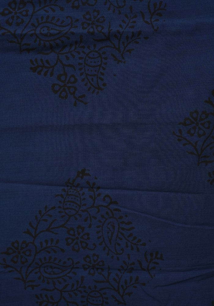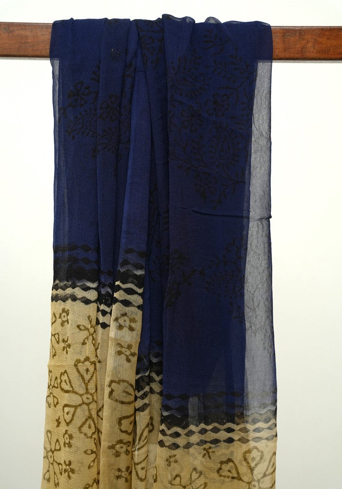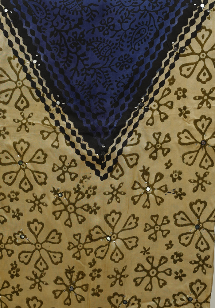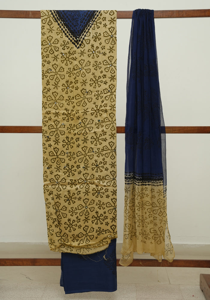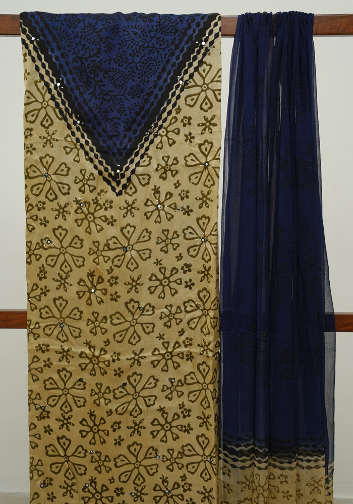 Light Brown and Dark Blue Modal Silk Block Printed Unstitched Salwar Set With Mirror and Badla Work