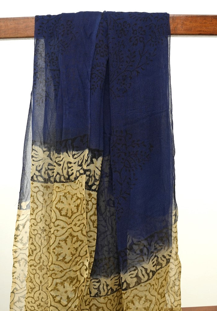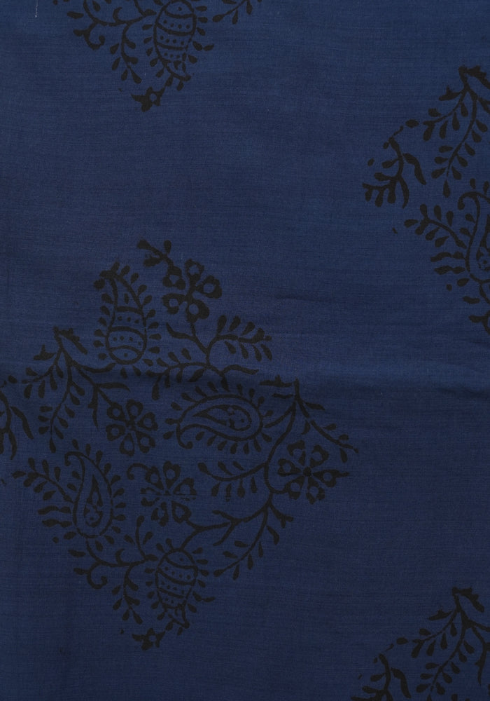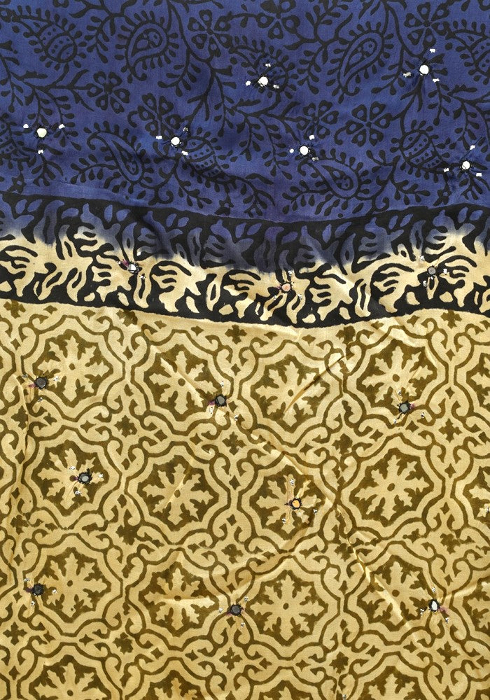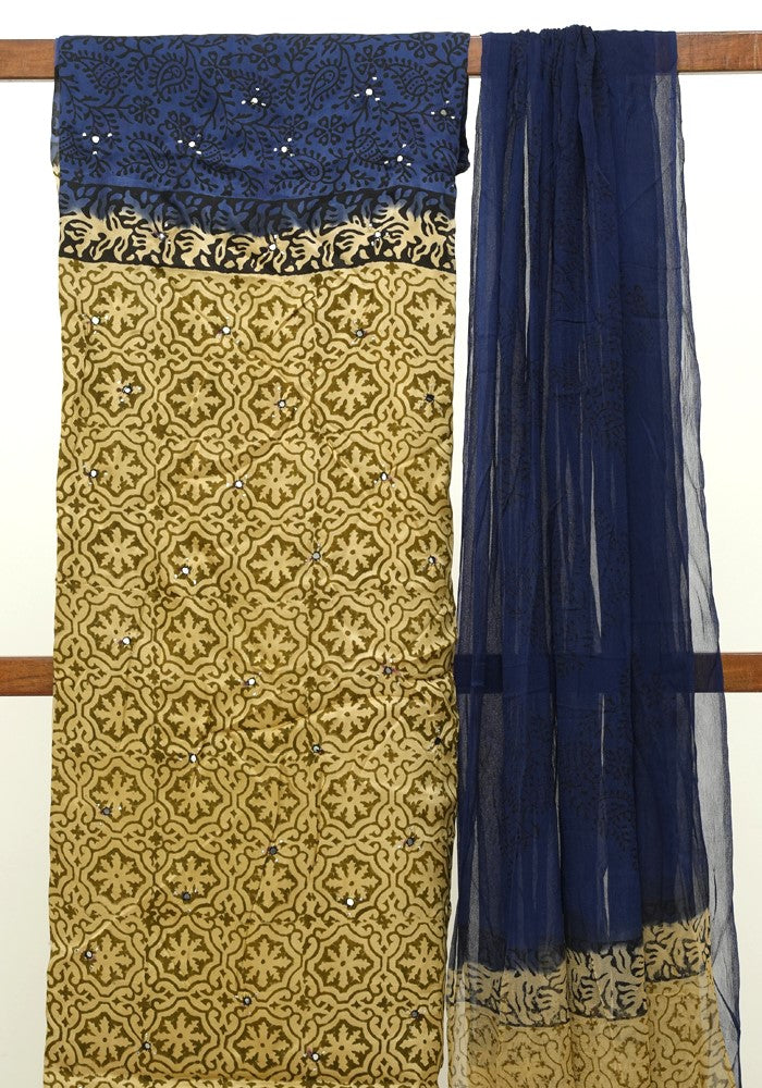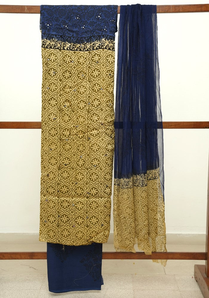 Light Brown and Dark Blue Modal Silk Block Printed Unstitched Salwar Set With Mirror and Badla Work