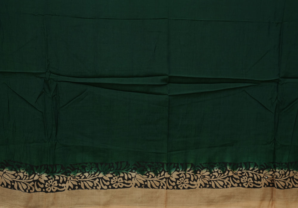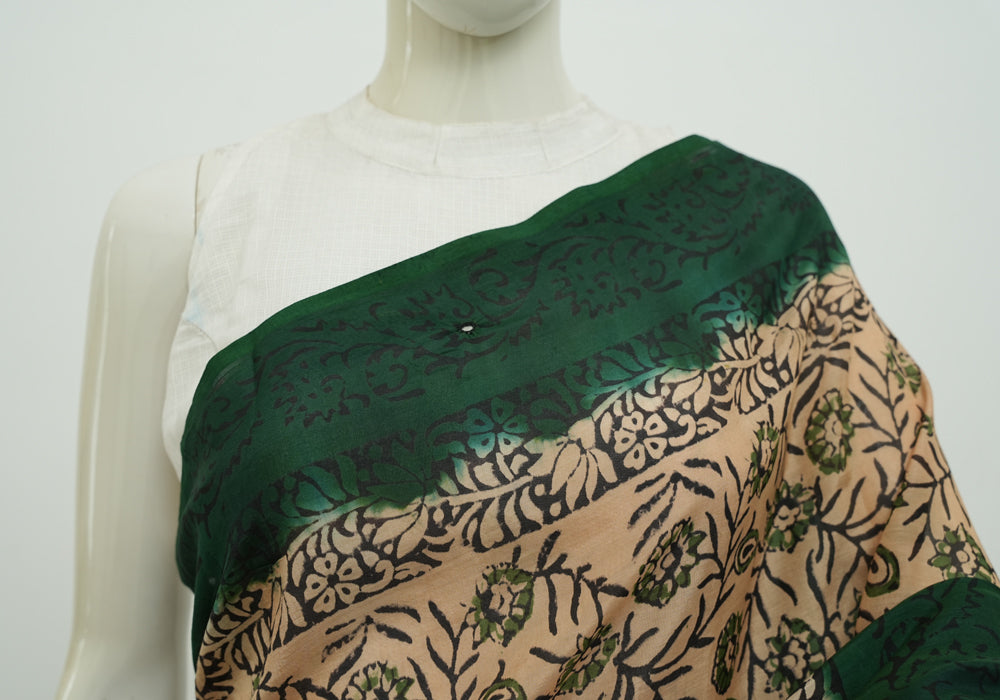 Light Brown and Dark Green Block Printed Chennur Silk Saree with Mirror Work