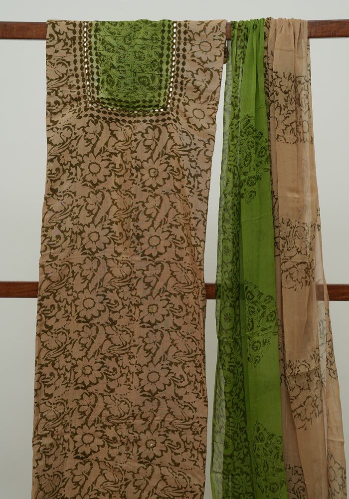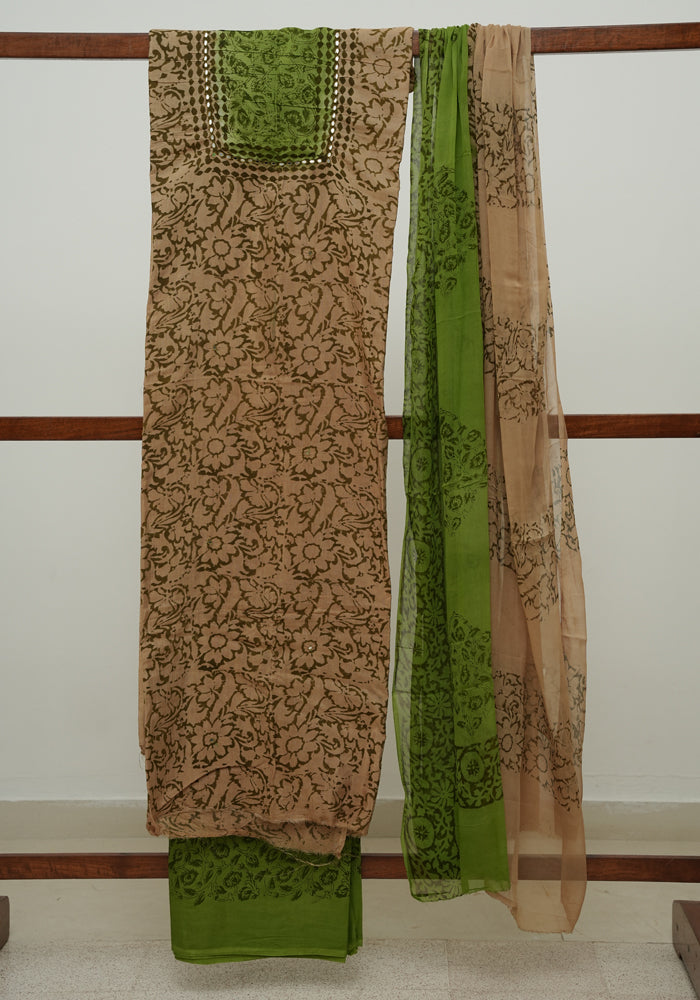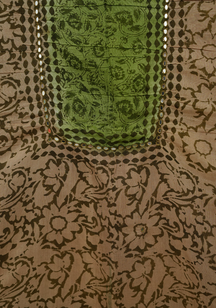 Light Brown and Green Unstitched Chennur Silk Salwar Set With Mirror Work