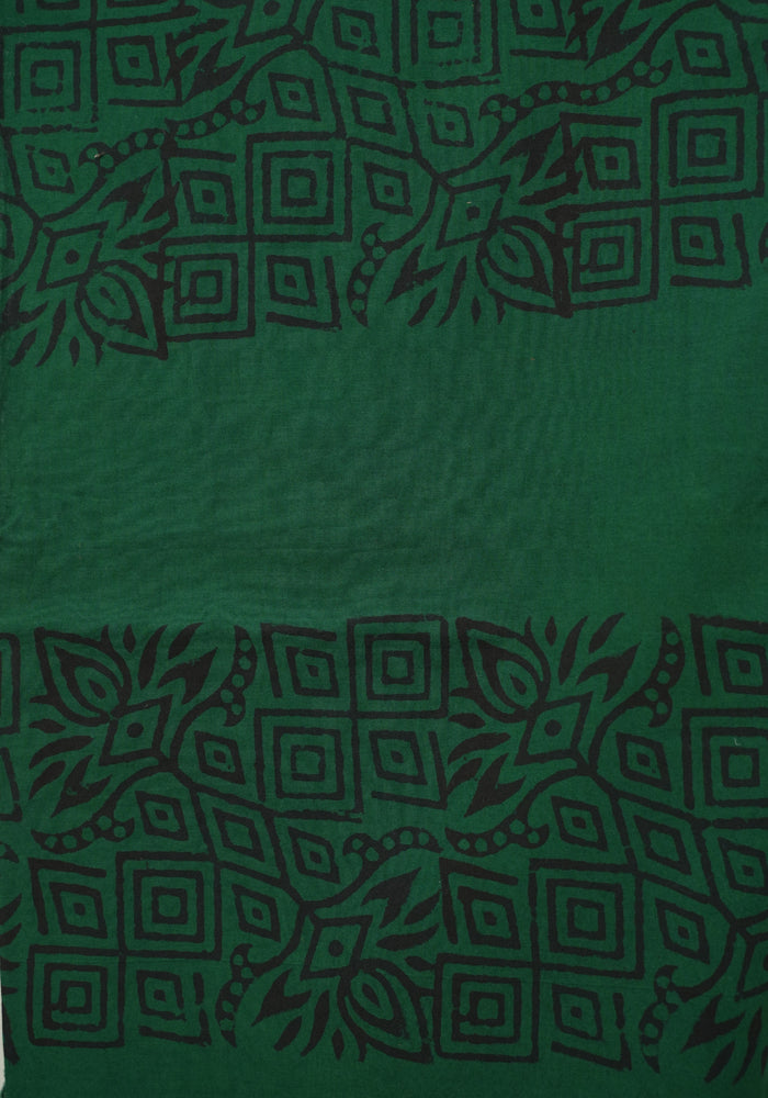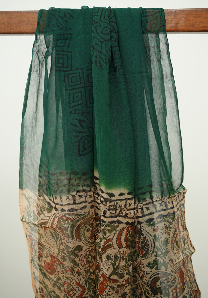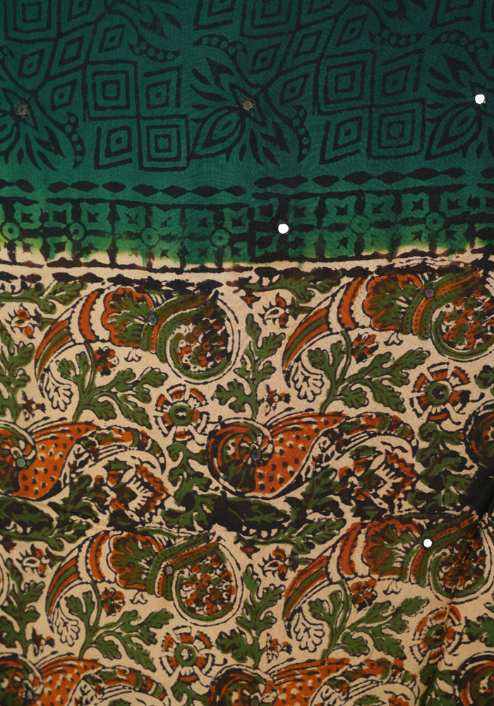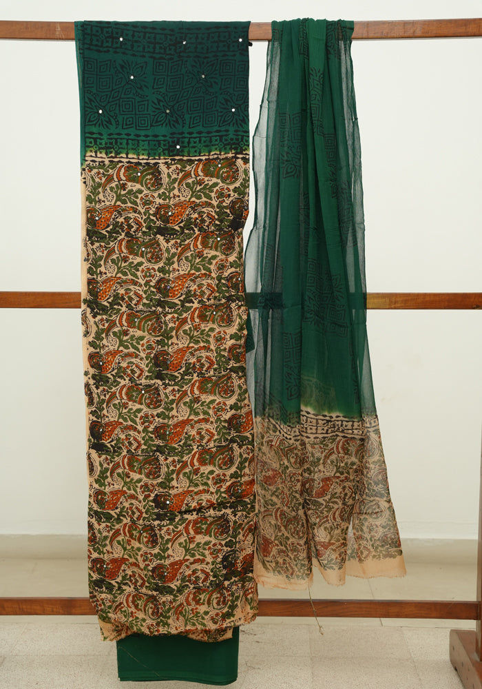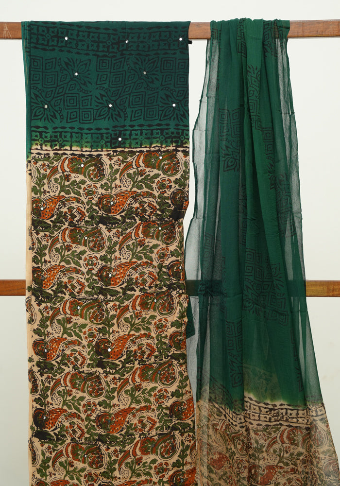Light Brown and Green Unstitched Kalamkari Block Printed Muslin Salwar Set with Mirror Work