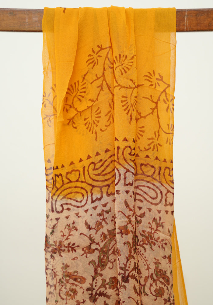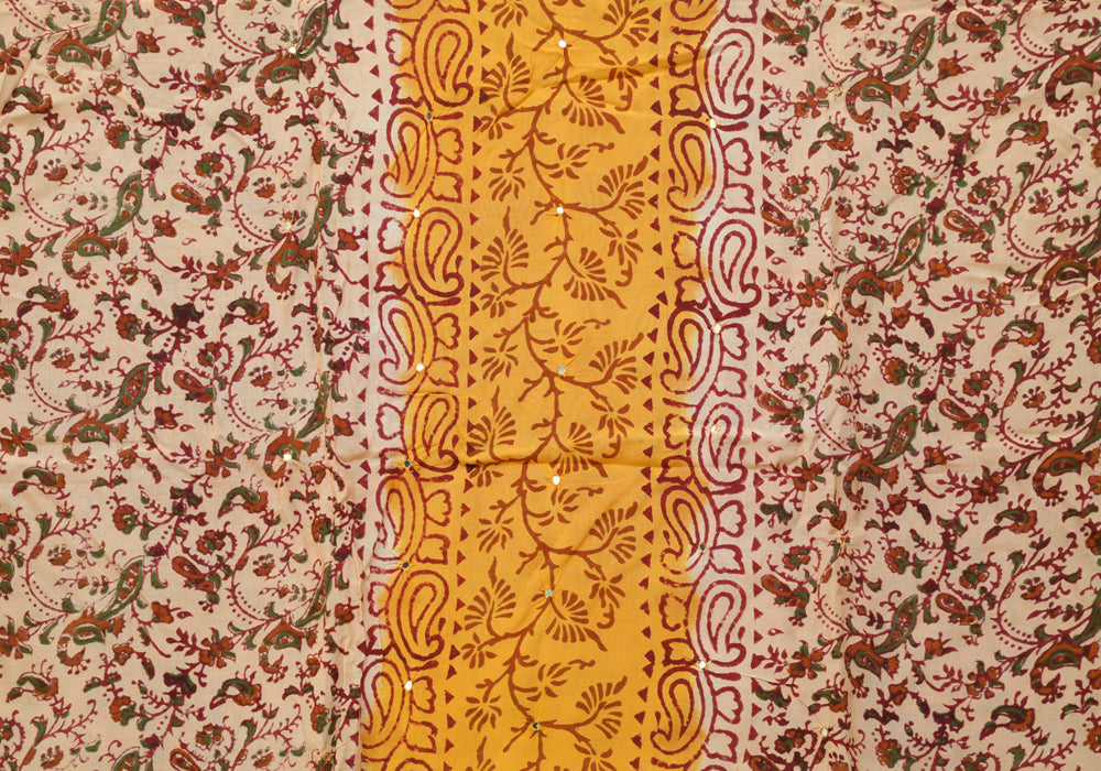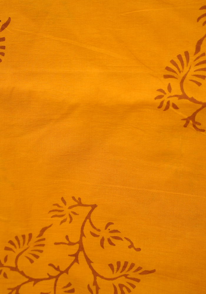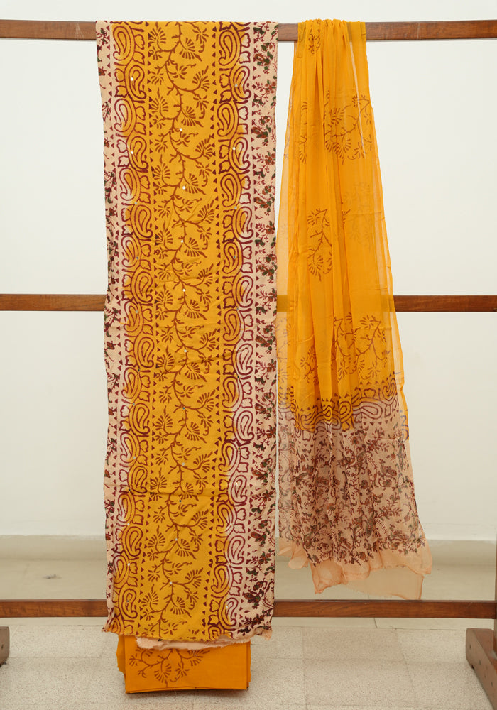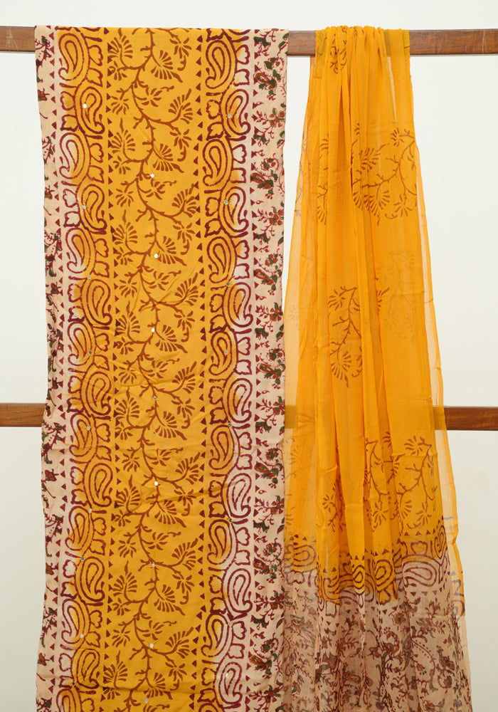 Light Brown and Mango Yellow Unstitched Kalamkari Block Printed Muslin Salwar Set with Mirror Work