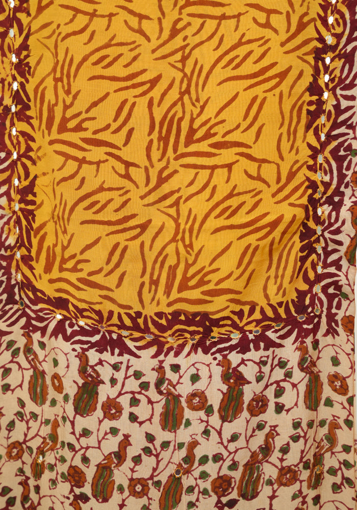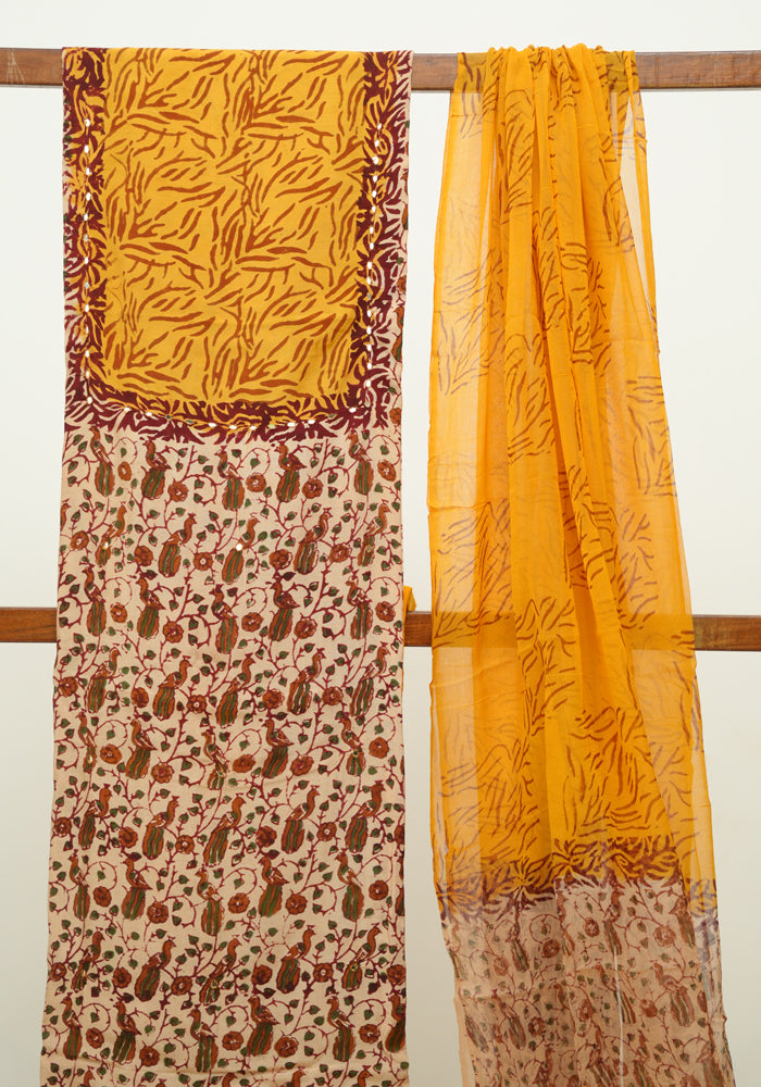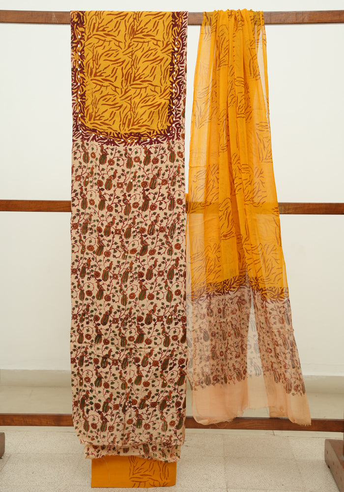 Light Brown and Mango Yellow Unstitched Kalamkari Block Printed Muslin Salwar Set with Mirror Work