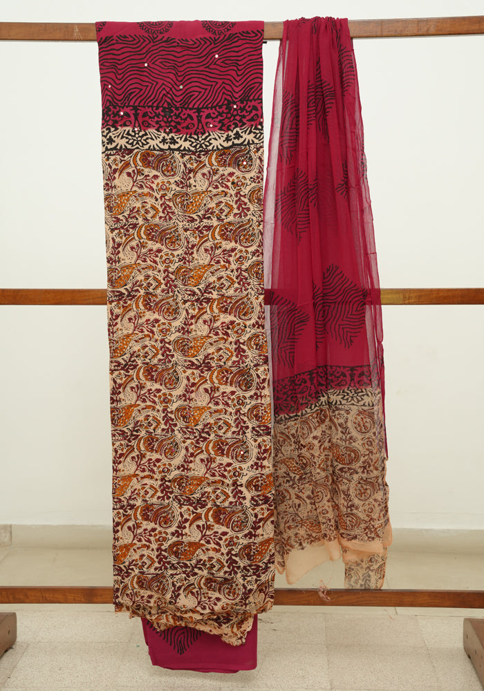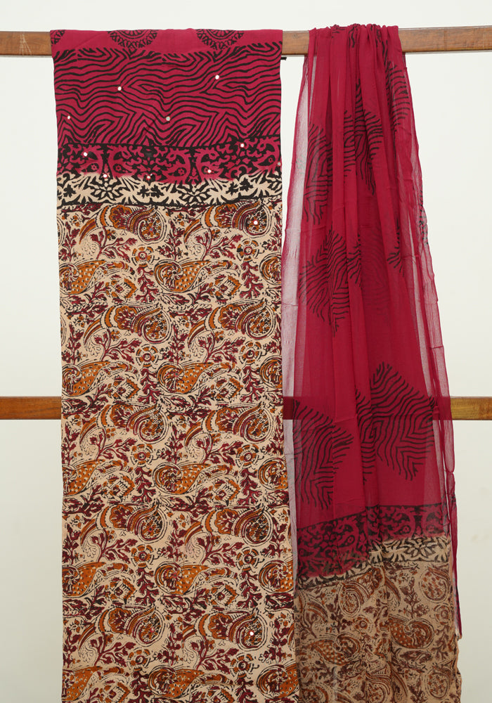 Light Brown and Maroon Unstitched Kalamkari Block Printed Muslin Salwar Set with Mirror Work