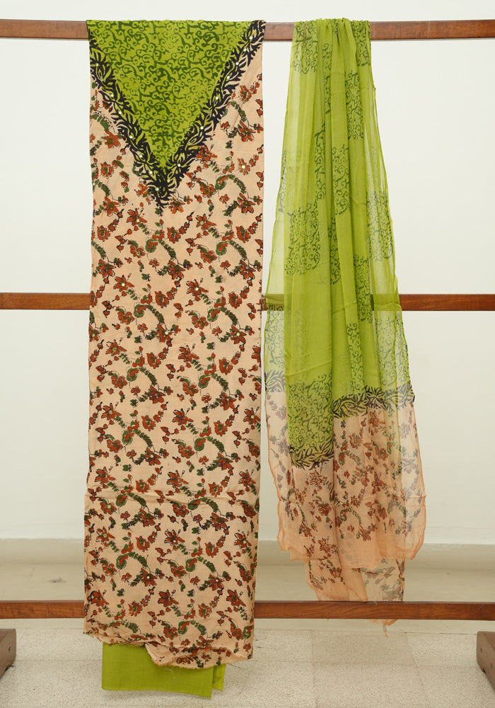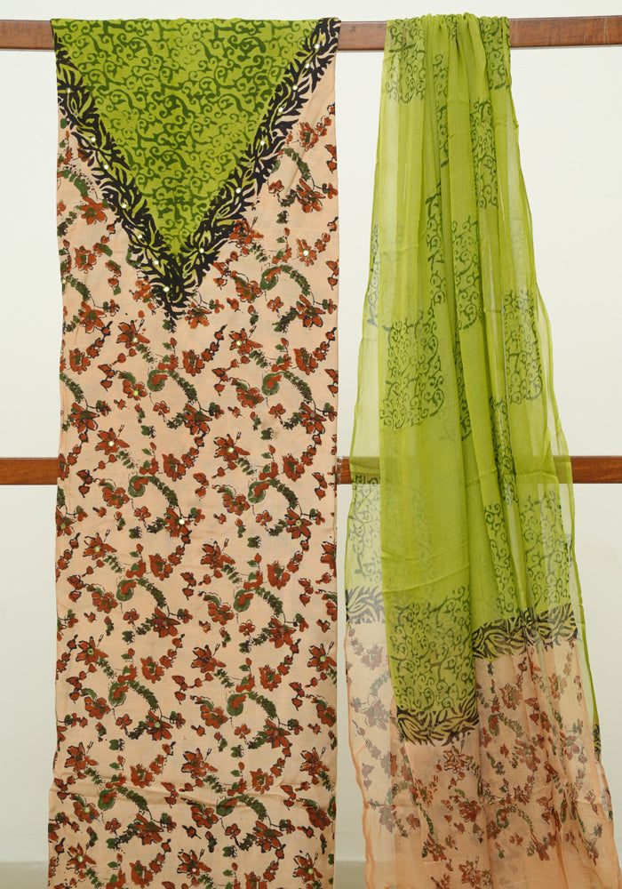 Light Brown and Mehandi Green Unstitched Kalamkari Block Printed Muslin Salwar Set with Mirror Work