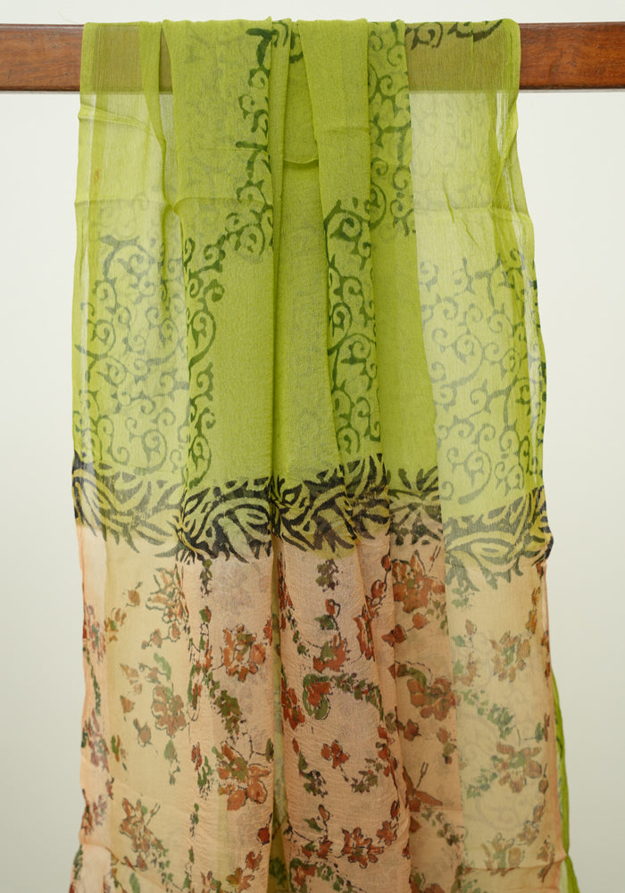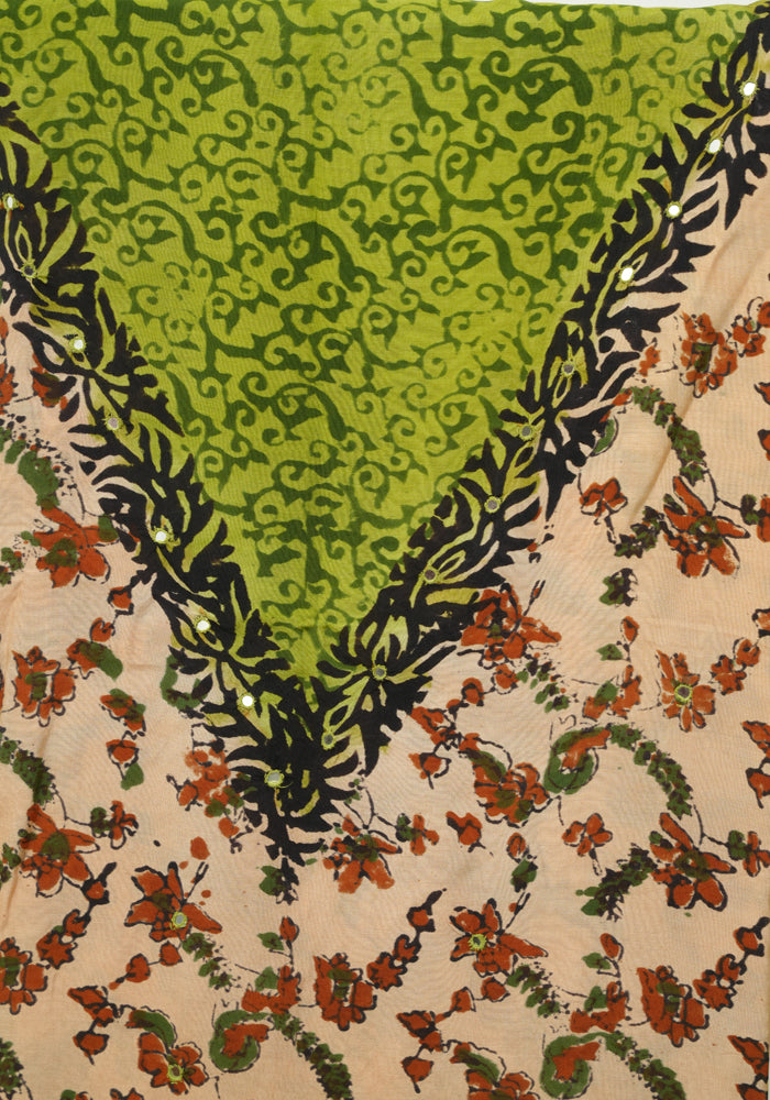 Light Brown and Mehandi Green Unstitched Kalamkari Block Printed Muslin Salwar Set with Mirror Work is OUT OF STOCK currently and available on pre-payment only. Order now for delivery within 2 weeks.