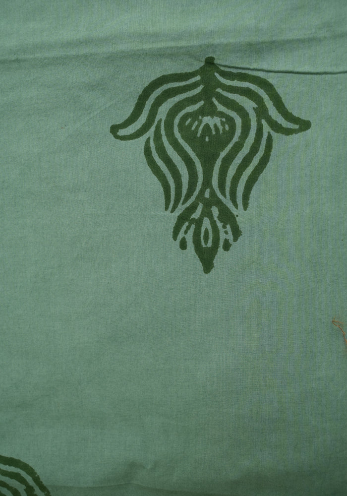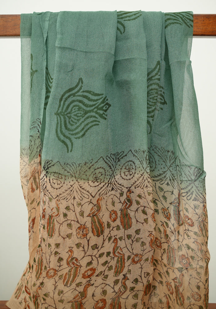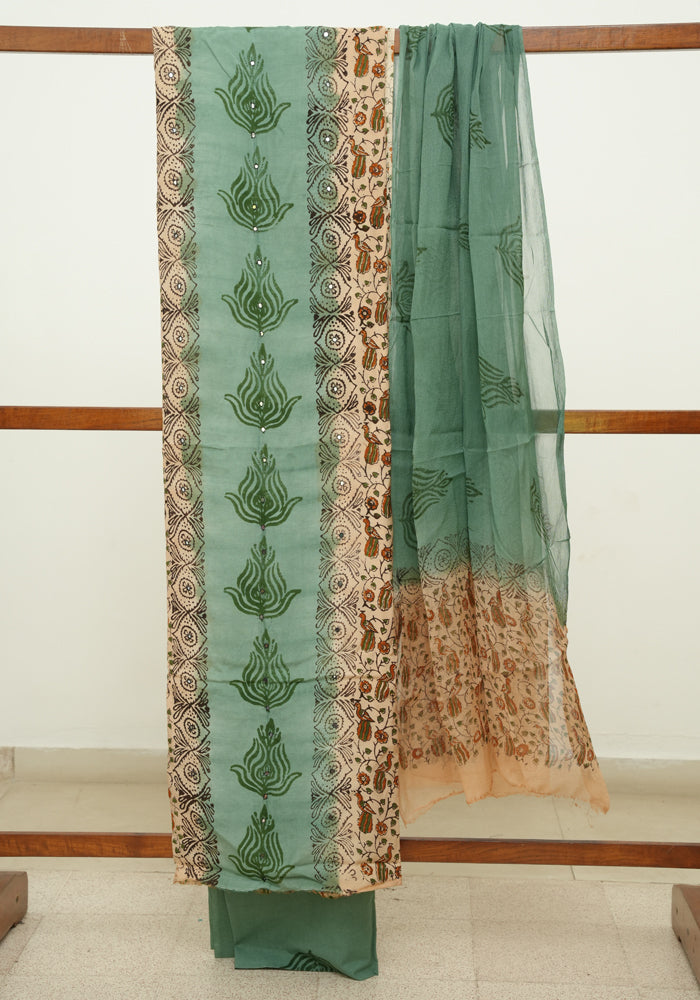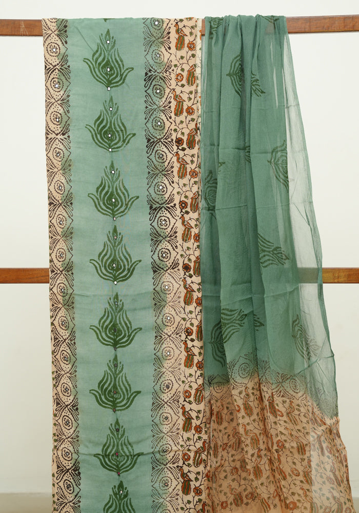 Light Brown and Moss Green Unstitched Kalamkari Block Printed Muslin Salwar Set with Mirror Work