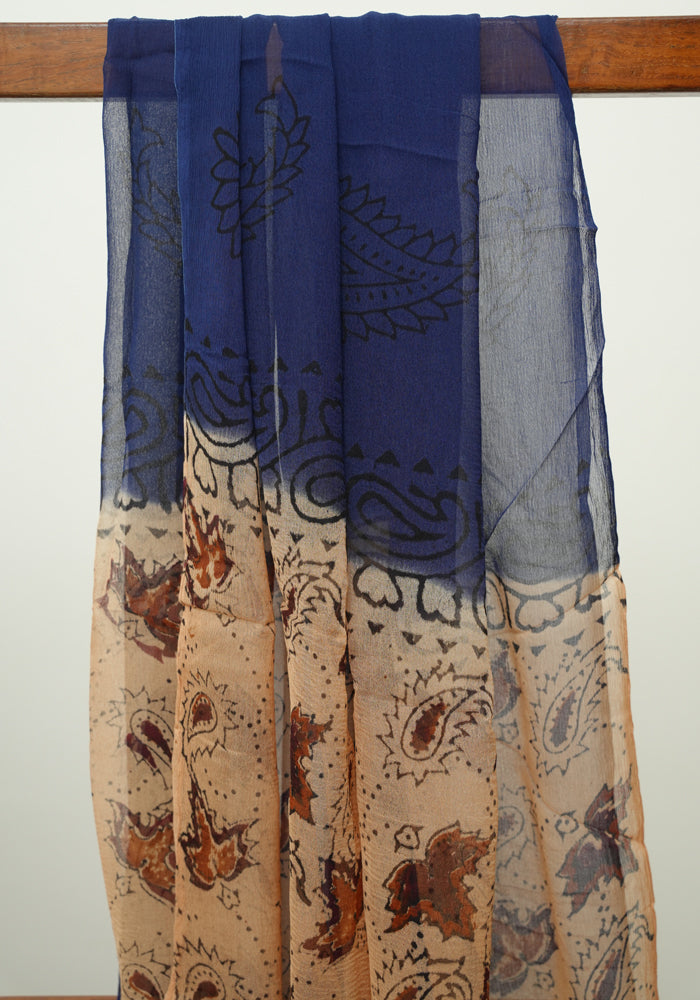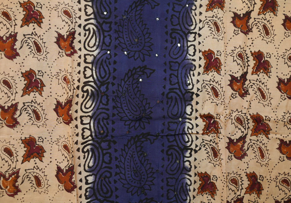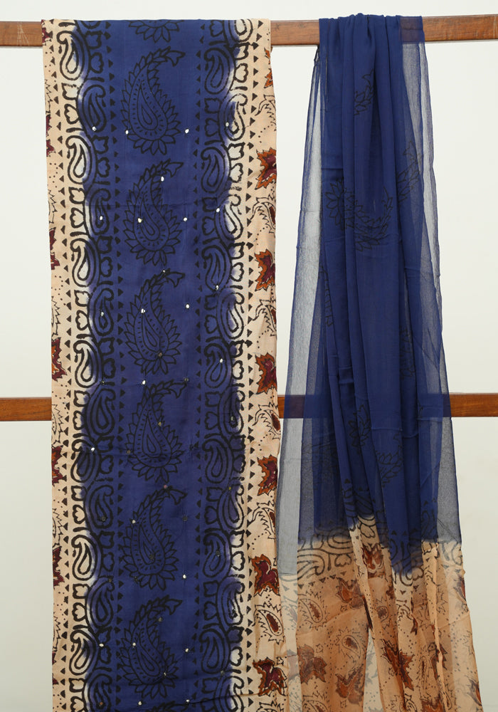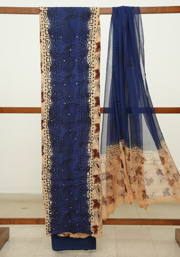 Light Brown and Navy Blue Unstitched Kalamkari Block Printed Muslin Salwar Set with Mirror Work