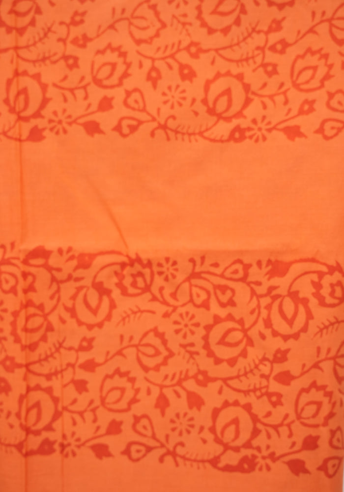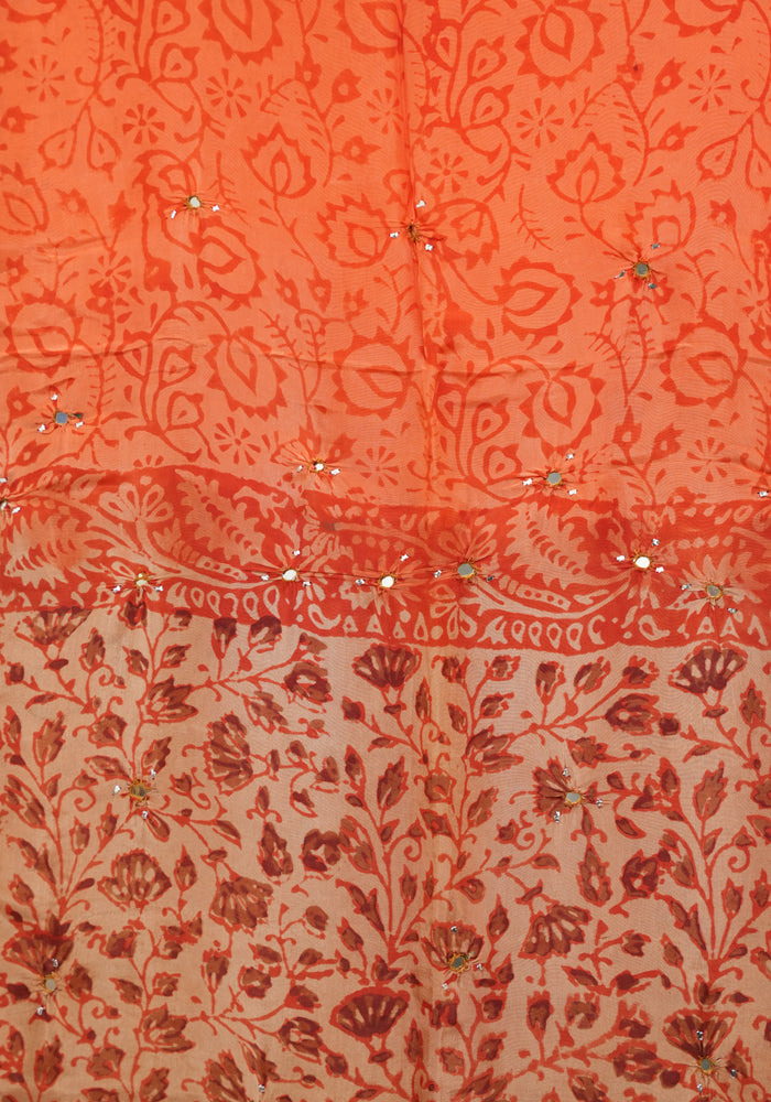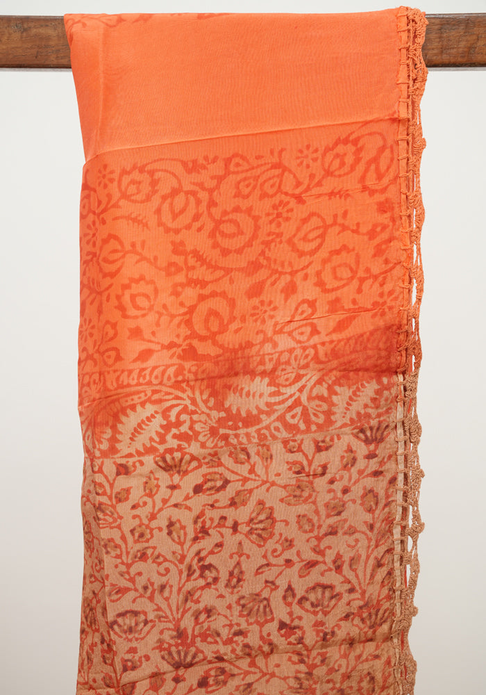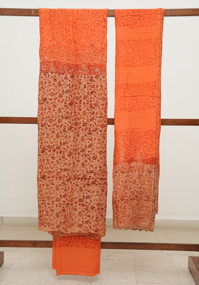 Light Brown and Orange Unstitched Blockprinted Semi Organza Salwar Set With Crochet Dupatta