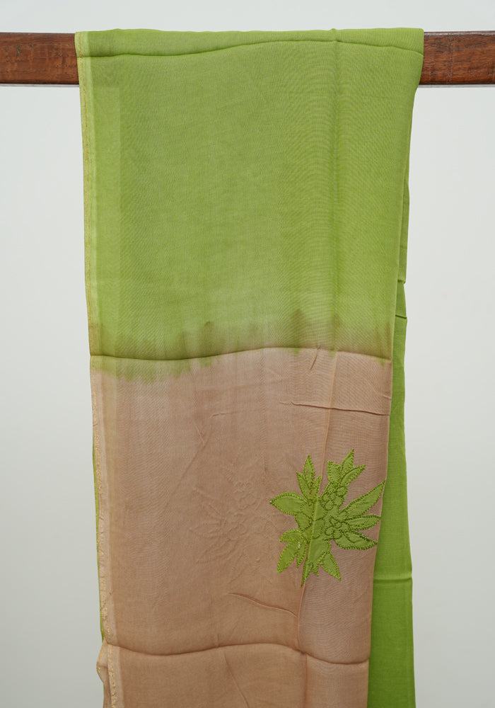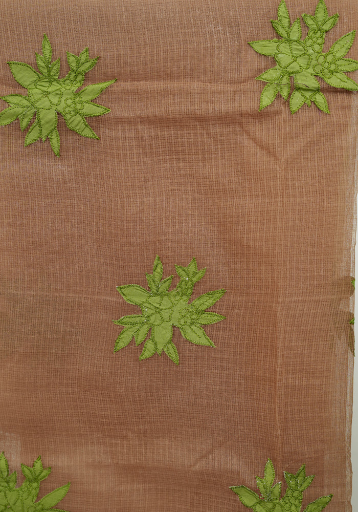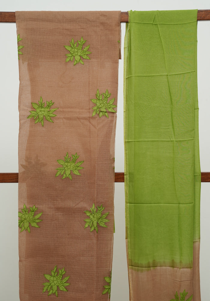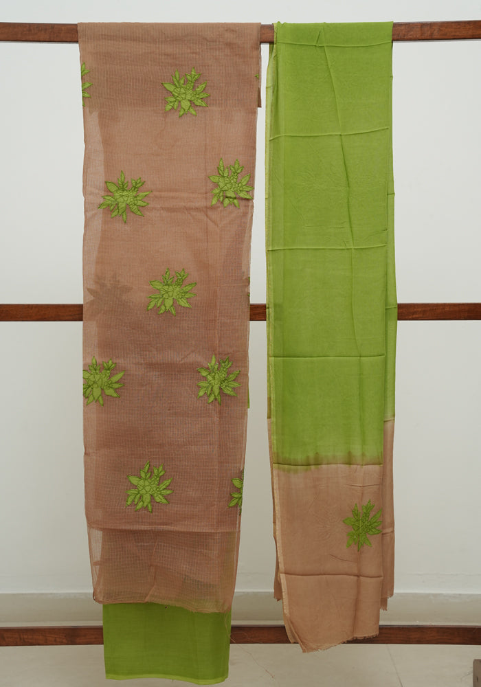 Light Brown and Parrot Green Unstitched Applique Work Kota Salwar Set With Silk Dupatta