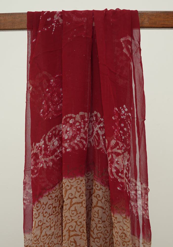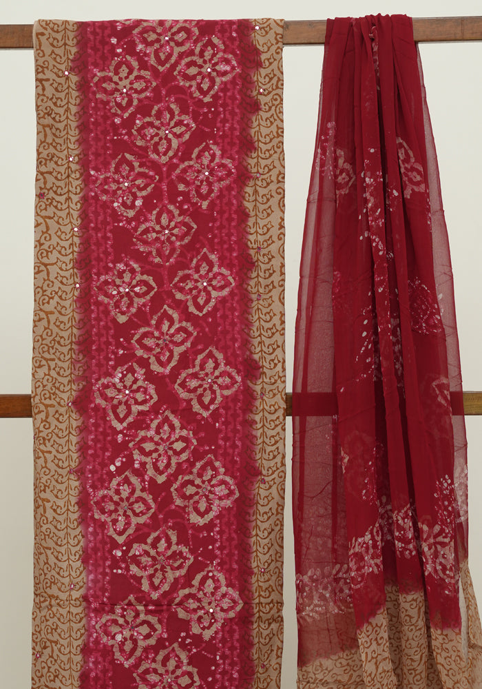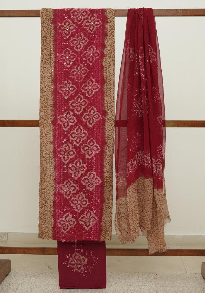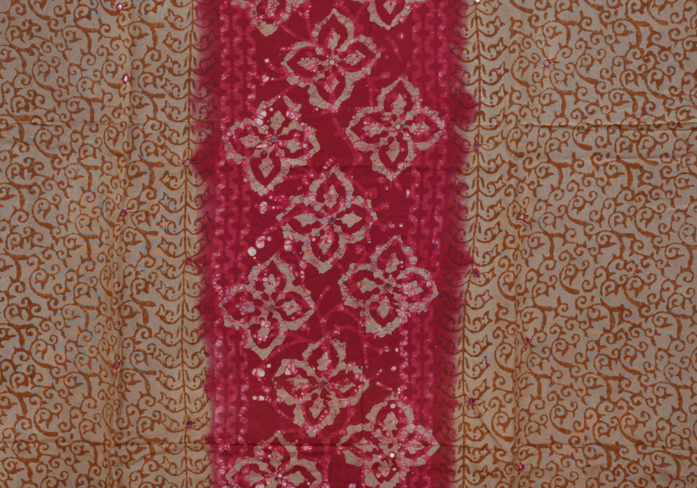 Light Brown and Red Batik Unstitched Muslin Chennur Silk Salwar Set With Mirror and Badla Work