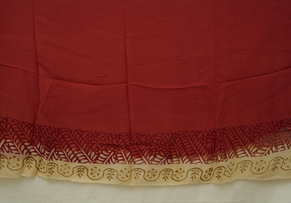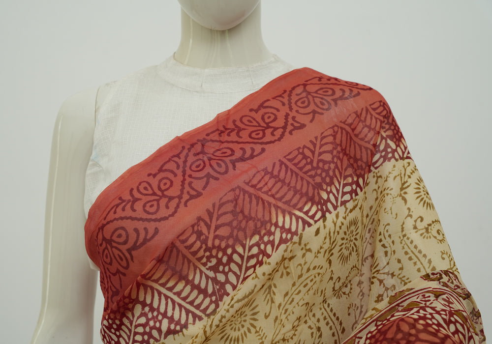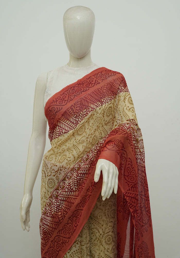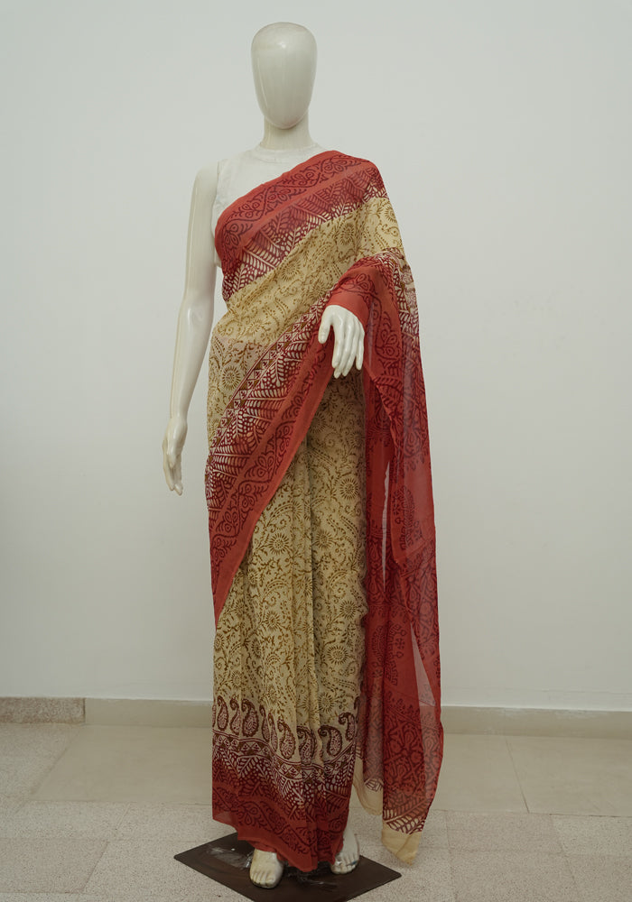 Light Brown and Rust Red Block Printed Georgette Saree is OUT OF STOCK currently and available on pre-payment only. Order now for delivery within 2 weeks.