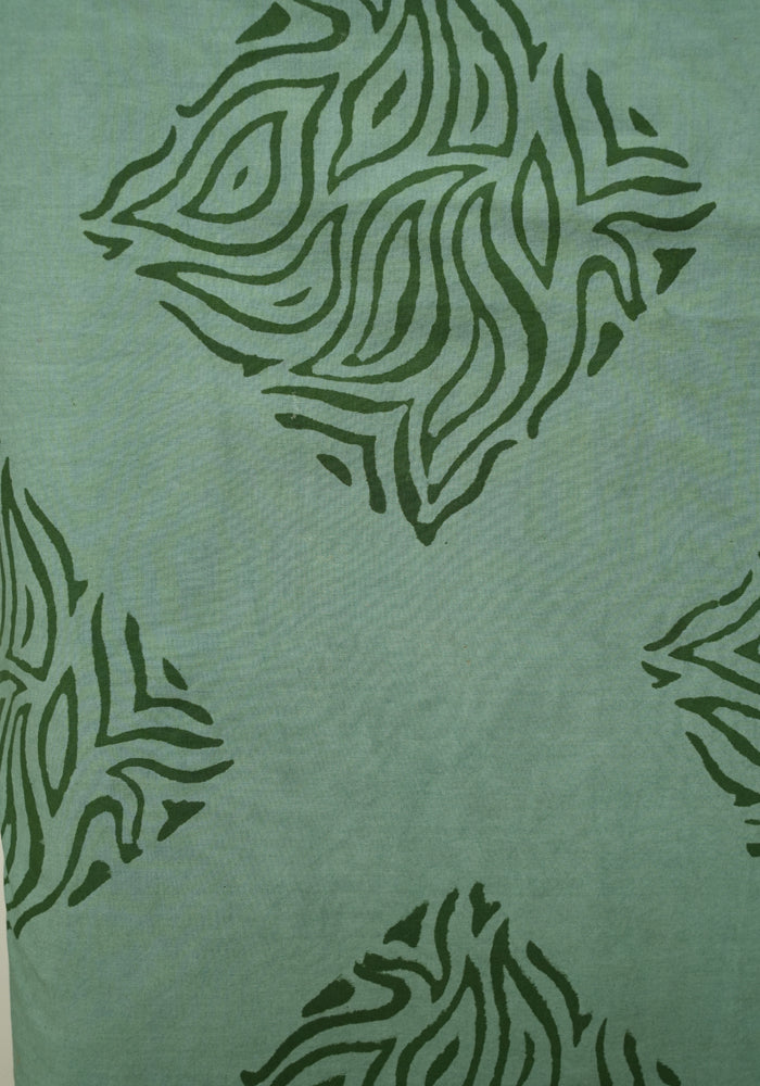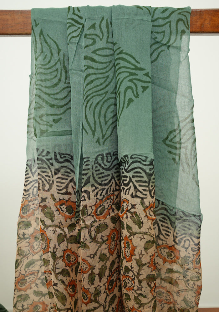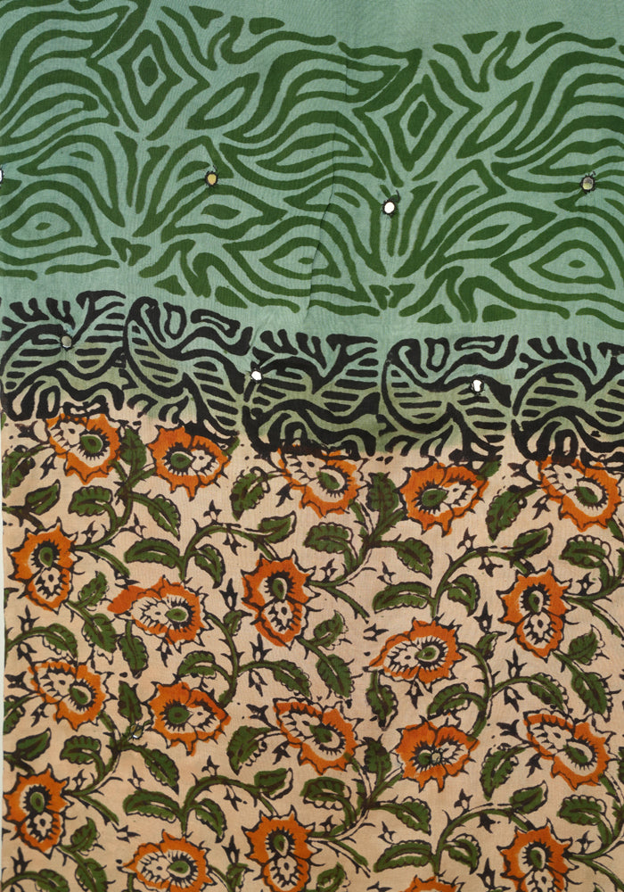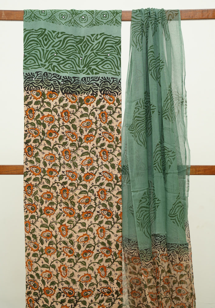 Light Brown and Teal Green Unstitched Kalamkari Block Printed Muslin Salwar Set with Mirror Work