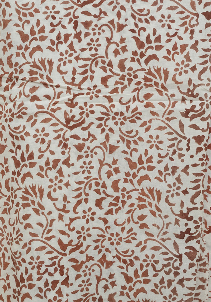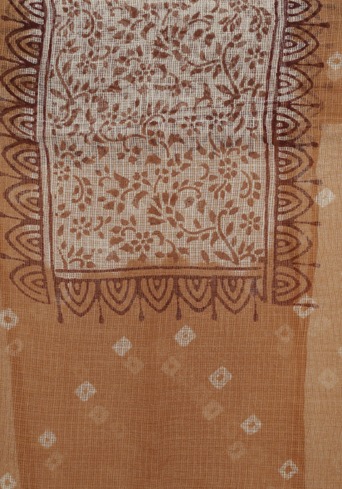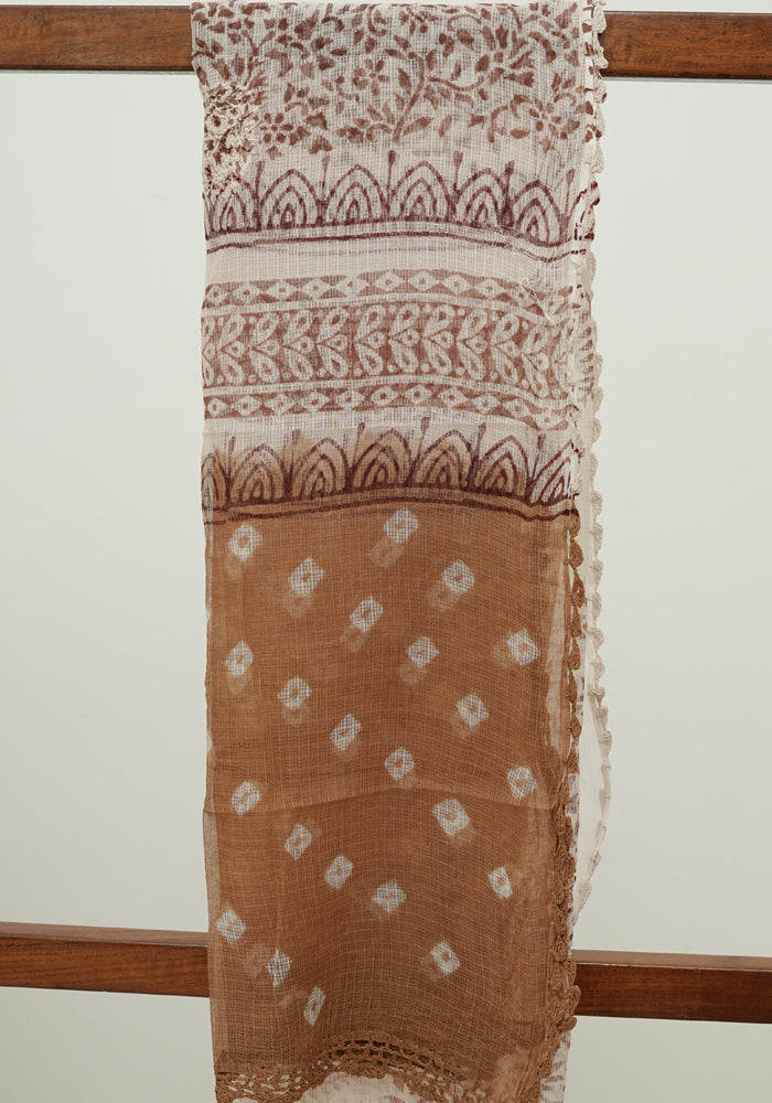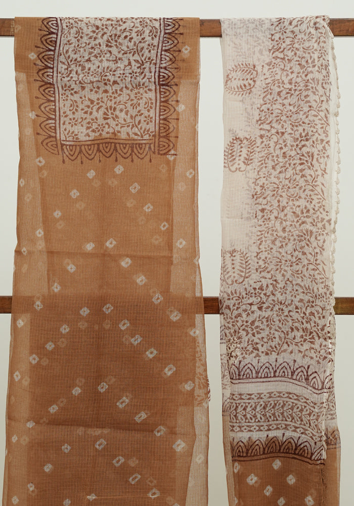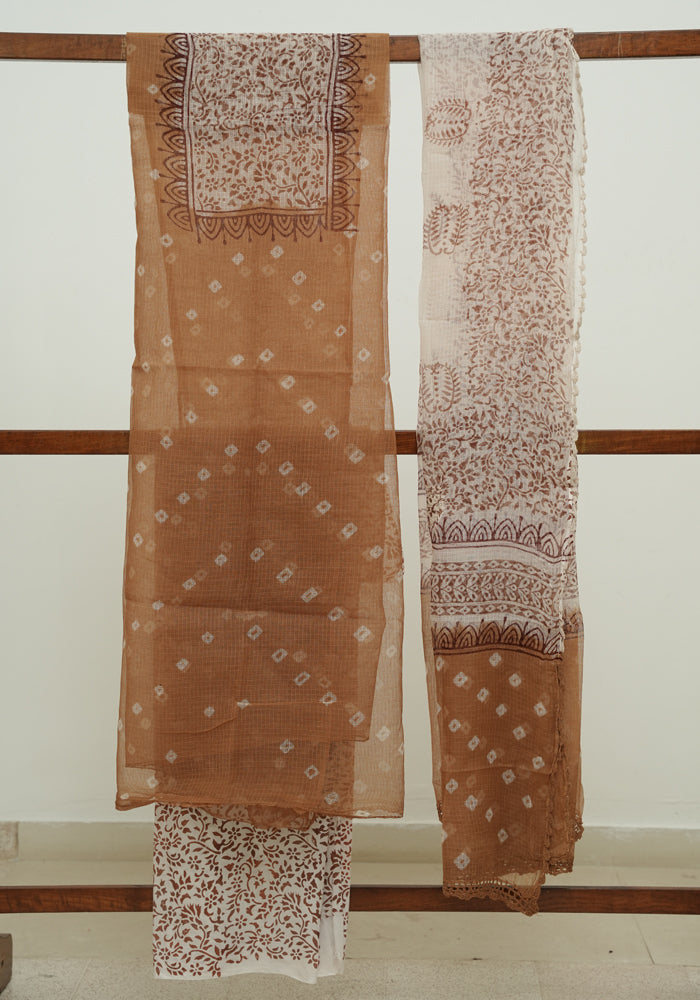 Light Brown and White Unstitched Block Printed Kota Salwar Set With Bandini and Crochet Dupatta