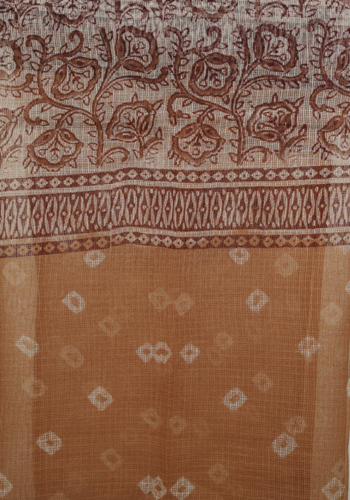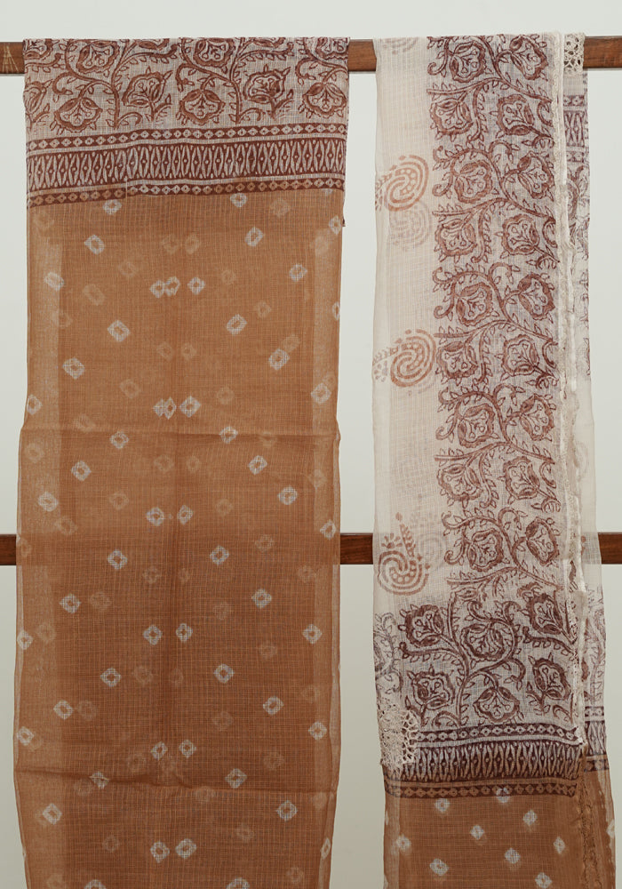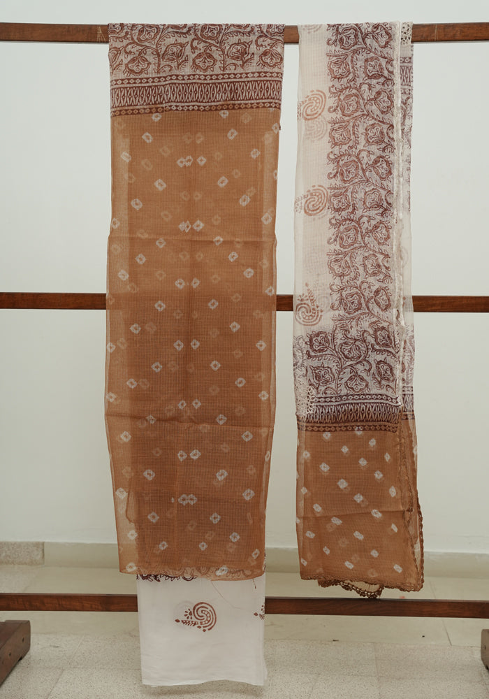 Light Brown and White Unstitched Block Printed Kota Salwar Set With Bandini and Crochet Dupatta