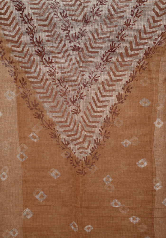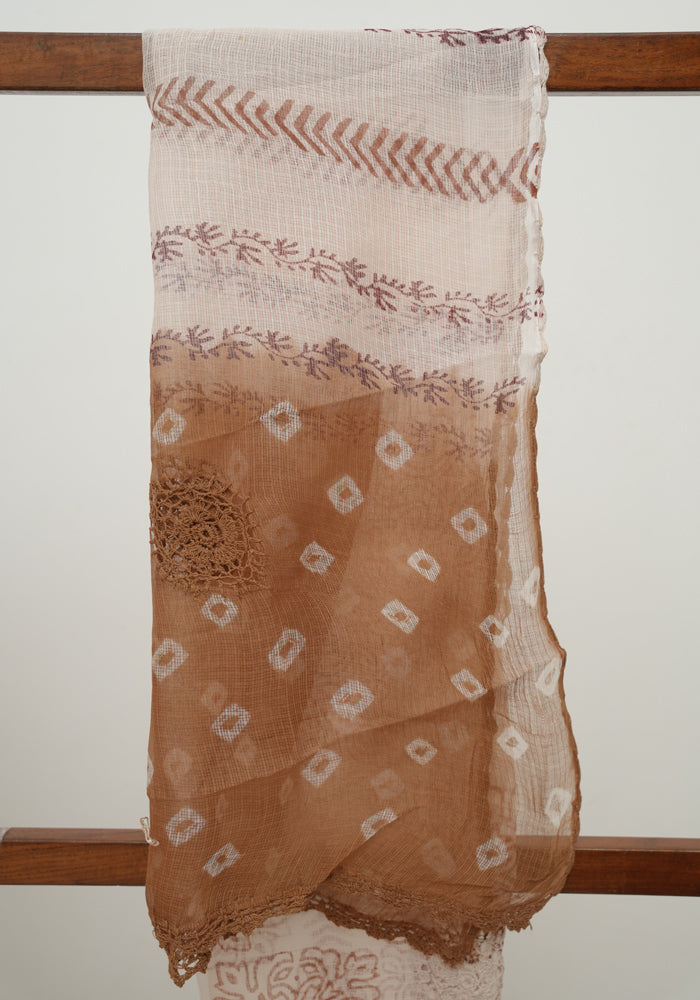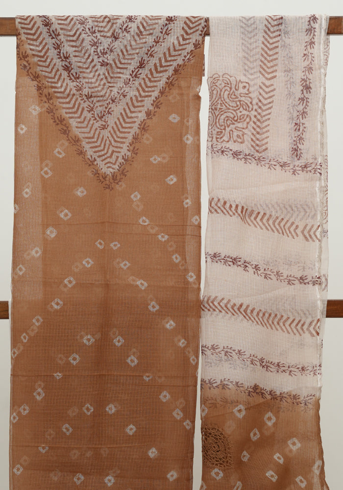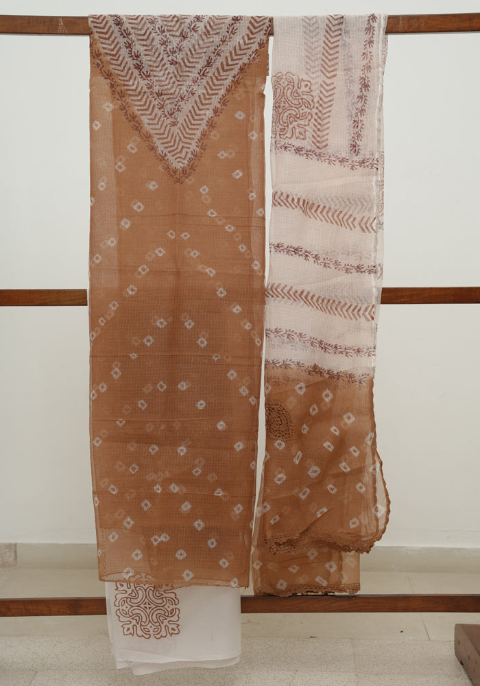 Light Brown and White Unstitched Block Printed Kota Salwar Set With Bandini and Crochet Dupatta